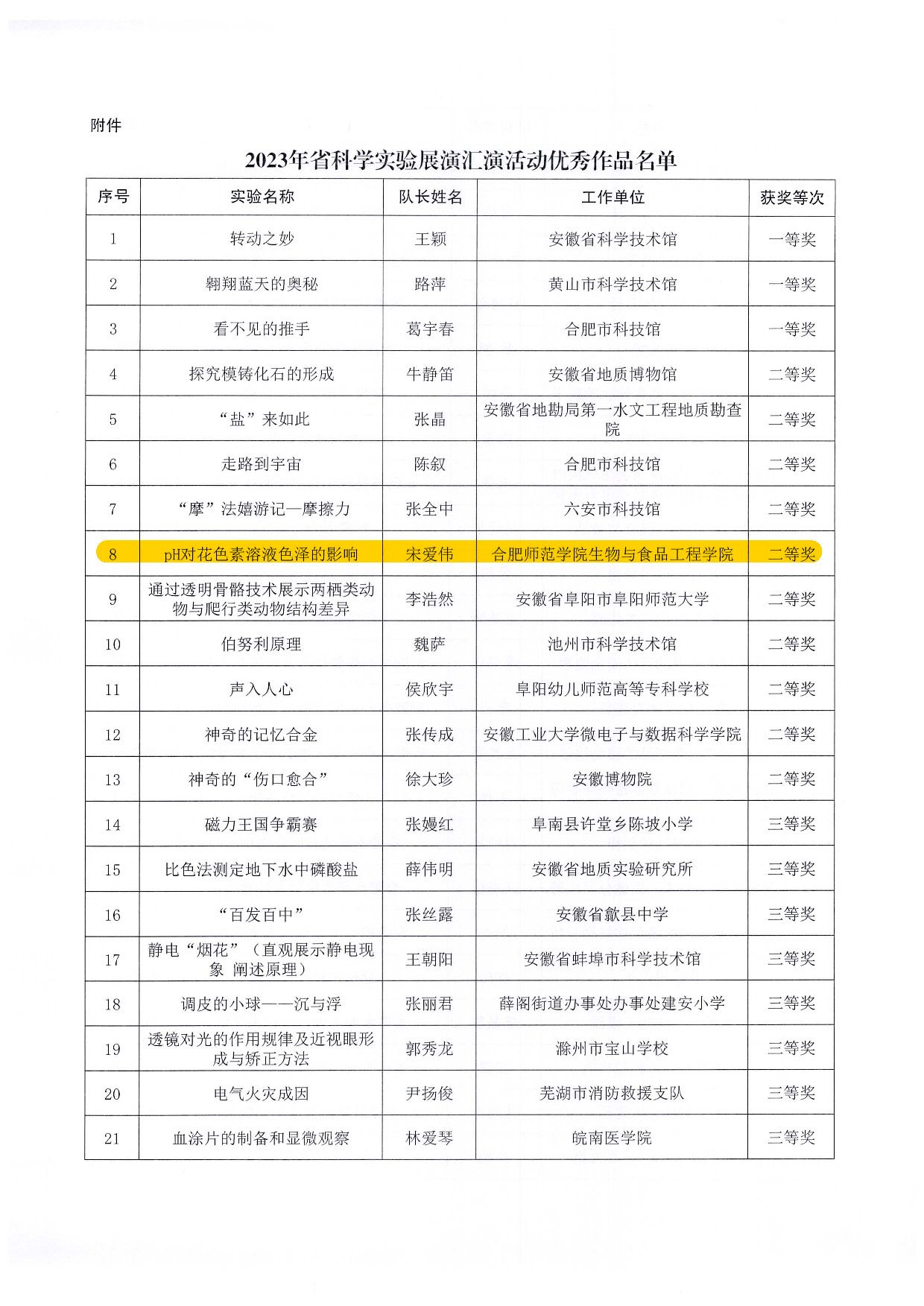 近日,安徽省科学技术厅发布了《关于2023年安徽省科学实验展演汇演活动获奖名单的通知》,beat365官网生物与食品工程学院宋爱伟团队报送的作品《pH对花色素溶液色泽的影响》荣获安徽省科学实验展演汇演二等奖。