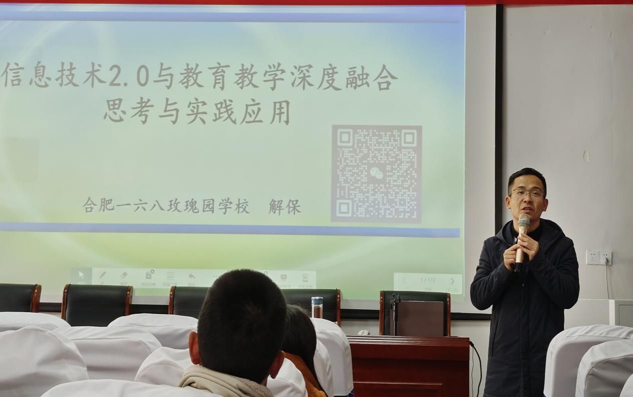 接着,合肥一六八玫瑰园学校教师胡春阳为学员们开展了“《教师数字素养》标准解读”的讲座。胡春阳长期深耕在教育一线,他深知在数字化、信息化的时代,不能用昨天的老办法教今天的新学生。他从数字化素养标准进行解读,对数字化意识、意愿、意志、社会责任等几个方面做了深刻阐述,尤其在应用方面,胡老师用理论联系实际,用通俗的语言、生动的案例、一手的数据让老师们知道如何利用教学资源解决教育教学中的实际问题。他号召全体老师要紧跟时代步伐,结合工作实际努力提升个人数字化教学能力,构建智慧课堂,同时积极以研促教,积极参加教育教学信息化大赛,通过各种活动、比赛提升自身的应用能力。通过此次讲座,老师们切实感受到信息化教学的魅力及当代教师信息能力提高的急切需求。