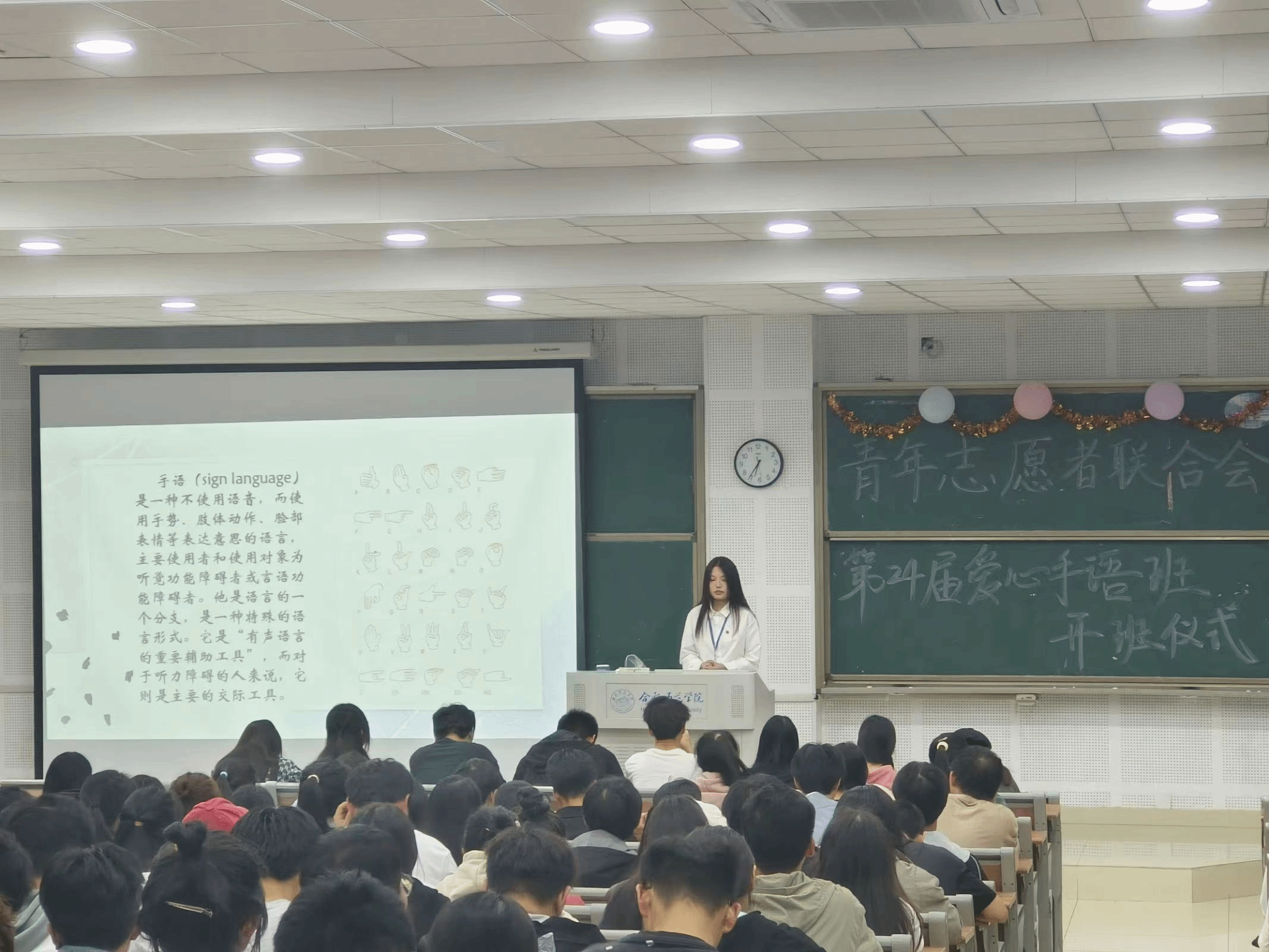 开班仪式上,青志联教学人员带来手语操表演《如愿》,悠扬清澈的歌声与整齐划一的手语结合,传达当今青年定不负使命,不负韶华的决心。在教学活动中,青志联教学人员分布在讲台和过道两侧,通过视频逐字逐句讲解动作要领与技巧,耐心纠正同学们的错误。本届爱心手语班累计开展了4次手语操教学活动,全校同学积极参与活动,获得广大师生的好评。青志联教学人员的热情互动和用心服务,温暖了每一位参与者的心,同学们充满激情,展现出青年一代朝气蓬勃的生命力。此次活动中同学们不仅收获手语基本知识,对听障群体有了更深入的了解,还在歌声中得到更多感动和力量去传承、去奋斗。