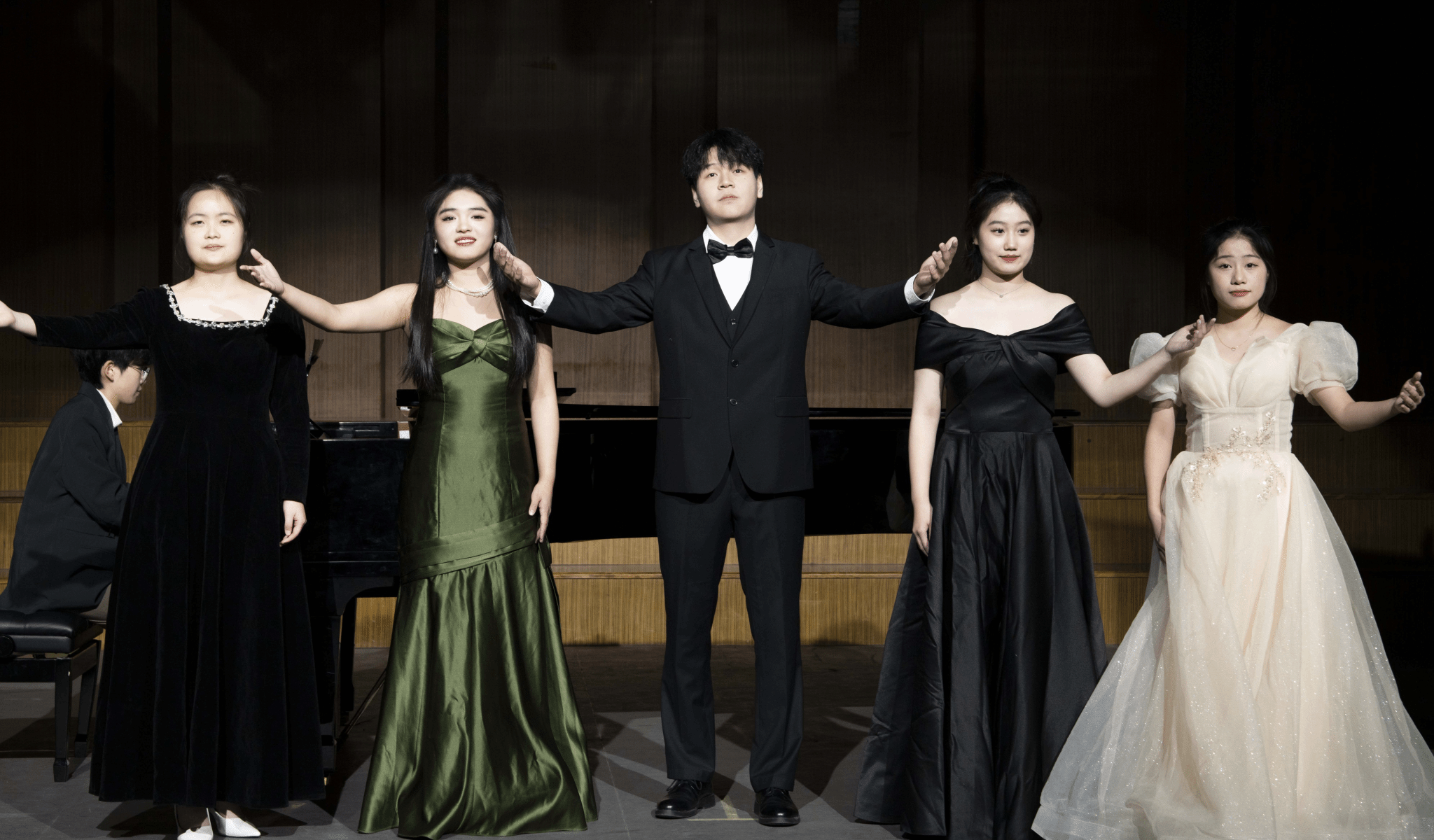 由江阔、王子璇、夏雨轩、张雨静、程诺五位同学带来的《城南送别》是以李叔同的《送别》为元素创作出来的新作品,既包含《送别》的忧伤,又有合唱作品的饱满色彩。王雷、高震演绎的最后两首歌曲《告别,在黎明时刻》《我们的世界》是新创音乐剧《有一天》中的两个选段,表达了革命者对光明的向往、对党的忠诚、对信仰的坚定,终将使胜利成为必然。
