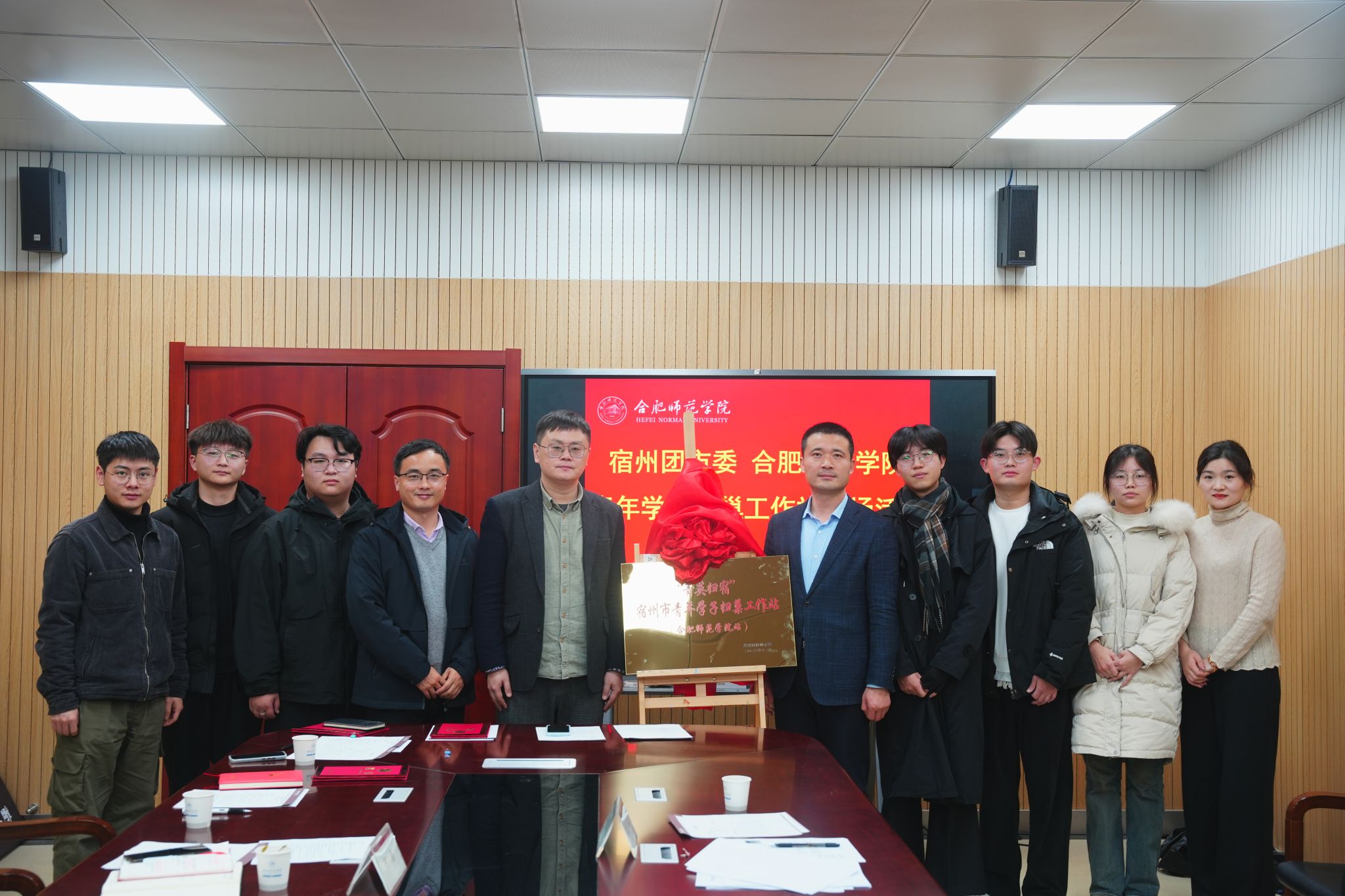 活动过程中,校地双方就加强青年学生交流、促进大学生就业创业等工作进行了座谈。刁文彬介绍了院团委与宿州团市委在“行知学堂”等社会实践方面的合作情况,并介绍了学院共青团组织促进大学生就业方面相关工作情况。谢颖锋介绍了“菁英归宿”青年学子归巢工作站建设、大学生实习实践相关工作情况,并就宿州市人才政策、就业创业政策进行了解读。随后,双方签署了“菁英归宿”青年学子归巢工作站合作协议,为新聘任的“菁英归宿”青年学子归巢工作站站长、副站长颁发聘书。活动最后,双方共同为“菁英归宿”青年学子归巢工作站揭牌。