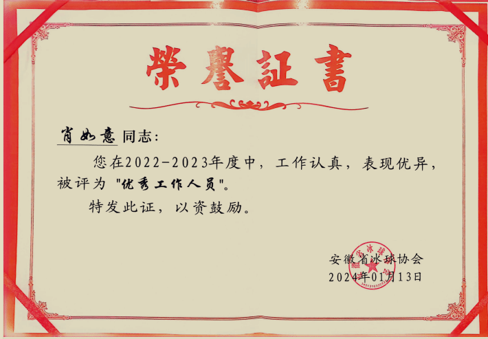 会议还对2023年度为安徽省冰球事业做出突出贡献和成绩的单位及个人进行了表彰,我院体育科学学院肖如意老师获评安徽省冰球协会“优秀工作人员”,beat365在线唯一官网获评安徽省冰球项目“优秀组织单位”。