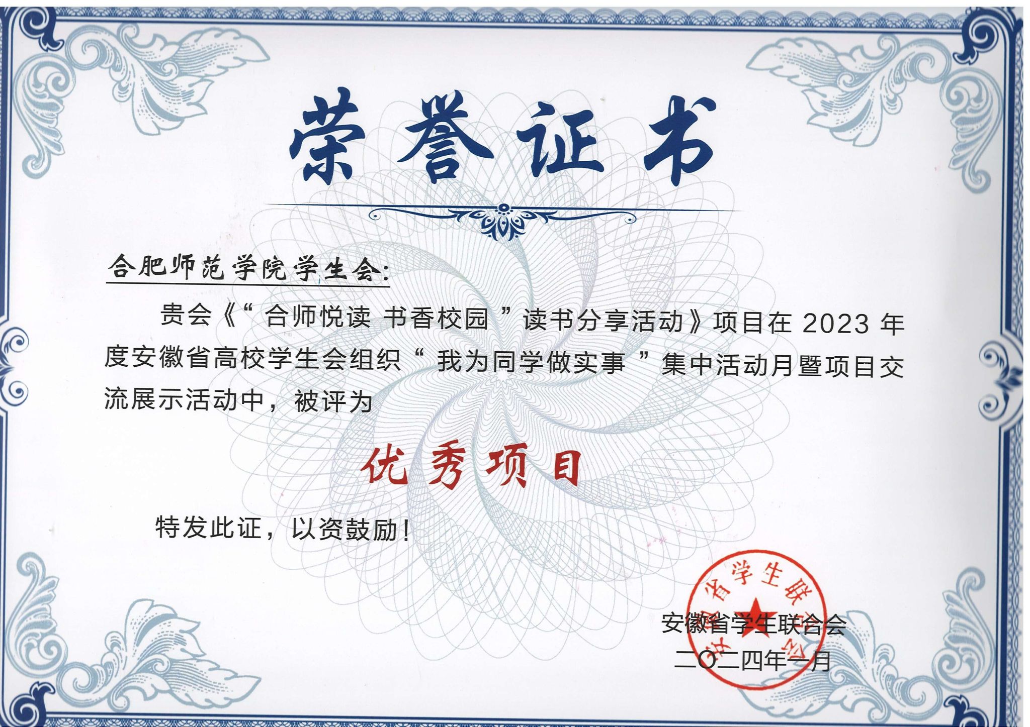 近日,共青团安徽省委员会和安徽省学生联合会开展2023年度全省高校学生会组织“我为同学做实事”项目评选,活动以“学思想·做实事·树新风”为主题,全省共有97所高校、229个项目申报。我院学生会“合师悦读 书香校园”读书分享活动获评全省高校学生会组织“我为同学做实事”优秀项目。