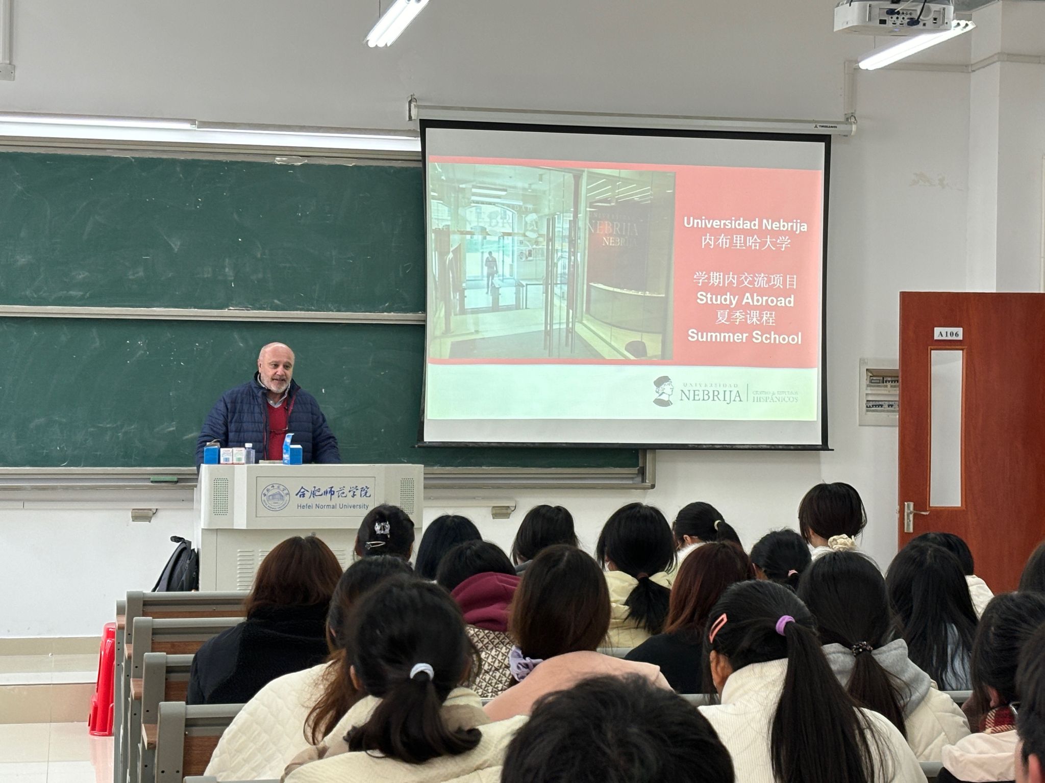 蒋道华首先转达了beat365在线唯一官网院领导对来访嘉宾的热烈欢迎,并对深化两校合作提出了一些建议。其次,来访代表Lluvia Xu着重介绍了内布里哈大学的西班牙语专业建设优势、我院学生目前在内布里哈大学的学习生活情况和进一步推进两校多层次合作的愿望,特别是对beat365官网两位同学赴布里哈大学学习优异表现给予了高度的评价,希望今后更多的beat365在线唯一官网学子能赴内布里哈大学学习交流。之后,吴礼敬详细介绍了外国语学院西班牙语专业的办学情况、特色建设和课程设置,希望通过此次交流能够进一步深化两校之间已建立的合作关系。张照介绍了西班牙语专业学生培养方面的具体情况,同时,希望两校能够深化西班牙语学科领域的学术合作、专业建设、教师研修和科研合作平台建设。其他参与见面会的西班牙语专业教师也从各方面谈了自己的看法,特别是在教师专业发展、数字资源共享、优势学科合作、科研共享平台搭建等多个领域的合作可能性进行了深入的沟通。最后,Javier Diaz为滨湖校区西班牙语专业学生做了一场宣讲会。