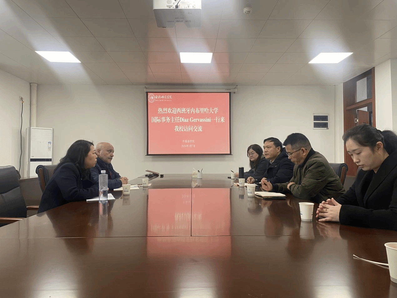 3月7日,西班牙内布里哈大学国际事务主任Javier Diaz和中国学术主任Lluvia Xu一行来我院访问交流。我院国际交流与合作处副处长蒋道华,外国语学院副院长吴礼敬,西班牙语系主任张照,西语专业教师代表叶芳菲、张弩,西语专业辅导员朱儒进、李超等在滨湖校区会议室接待了Diaz一行并进行了深入的交谈,会议由蒋道华主持。