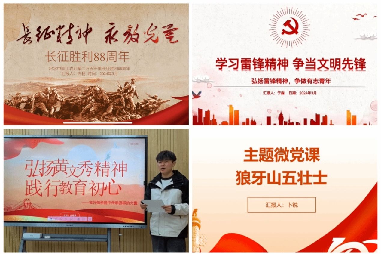 各位选手结合中国共产党历史上发生的重大事件、重要人物、红色精神等,生动形象的将鲜活的党史故事和红色精神分享给大家。陈子凡同学的微党课《赓续文脉,你我共守——做中华优秀传统文化的坚定继承者和践行者》深入浅出讲述了大学生该如何继承和践行中华优秀传统文化。闫祉彤同学的微党课《赓续红旗渠精神,争做新时代有为青年》讲述了红旗渠精神以及如何激扬红色精神、争做新时代有为青年。金健强同学的微党课《弘扬黄文秀精神,践行教育初心》讲述了黄文秀的事迹以及如何弘扬黄文秀精神。于淼同学的微党课《学习雷锋精神,争做文明先锋》介绍了雷锋精神的丰富内涵以及如何争做文明先锋。许杨同学的微党课《长征精神,永放光芒》讲述了长征精神的内涵,以及如何走好新时代“赶考路”。卜锐同学的微党课《狼牙山五壮士》讲述了狼牙山五壮士的英勇事迹,倡导广大青年大学生应传承英雄们的精神,用自己的行动为国家和人民贡献青春力量!