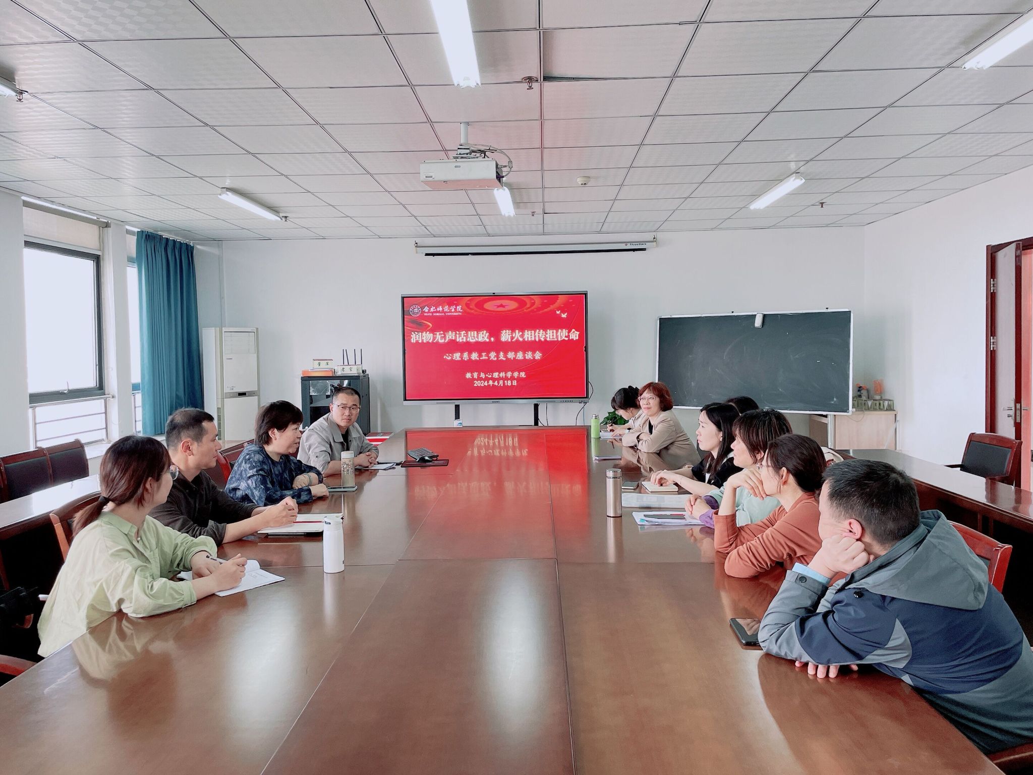 4月18日下午,教育与心理科学学院心理系教工党支部在锦绣校区行知楼710会议室召开“润物无声话思政,薪火相传担使命”主题座谈会。本次座谈会邀请即将荣休的李群教授主讲,心理系教工党支部全体党员参加会议,部分非党员教师列席会议,座谈会由支部书记黄凤主持。
