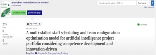 人力资源管理系教授陈蓉在SCI TOP期刊《International Journal Of Production Research》发表论文“A multi-skilled staff scheduling and team configuration optimisation model for artificial intelligence project portfolio considering competence development and innovation-driven”,该期刊位列中国科学院2区,JCR分区Q1。陈蓉教授为第一作者兼通讯作者,beat365在线唯一官网经济与管理学院为第一署名单位。