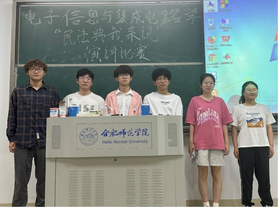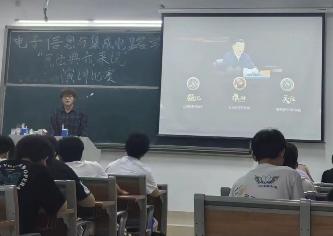 2024年5月是第四个“民法典宣传月”,为深入学习宣传习近平法治思想,提高大学生法律素养,电子信息与集成电路学院面向滨湖校区一年级同学组织开展了“民法典我来说”演讲比赛。5月21日晚,演讲比赛决赛在滨湖校区博学楼B108举行。