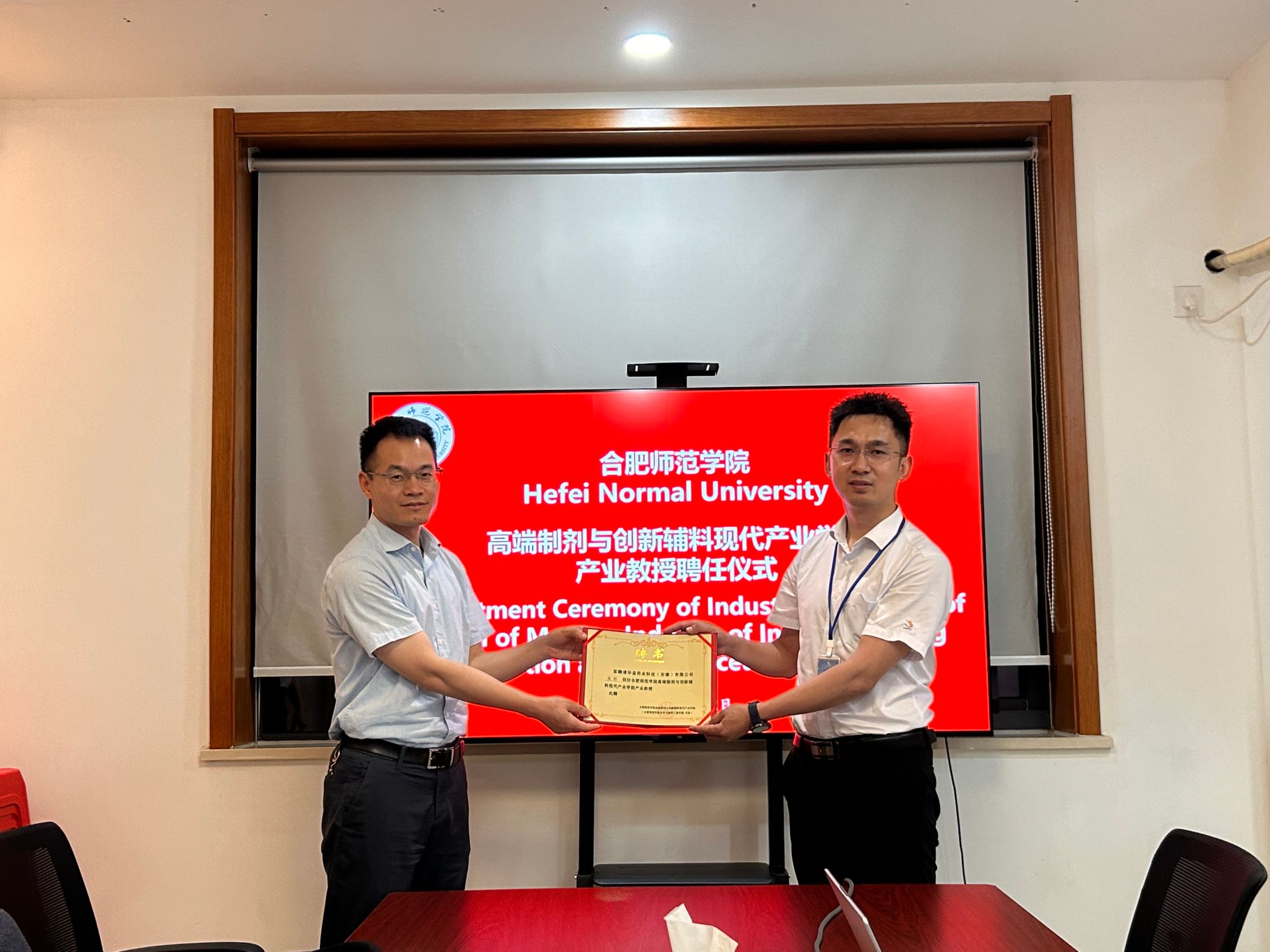 6月12日上午,化学与制药工程学院党委书记李红、院长朱金苗、副院长董雄辎携制药工程系主任及专业教师一行,赴华益药业科技(安徽)有限公司,参加beat365在线唯一官网与华益药业科技(安徽)有限公司等联合举办的“高端制剂与创新辅料现代产业学院产业教授聘任仪式”。华益药业科技(安徽)有限公司产业教授代表操铖、产业讲师代表周红蕾等出席会议,爱尔兰香农理工大学制药科学与生物技术系代表Nicholas Mullins出席会议,我院制药工程系代表参加会议,会议由华益药业科技(安徽)有限公司产品研发总经理操铖主持,公司外交经理吴莹莹翻译。