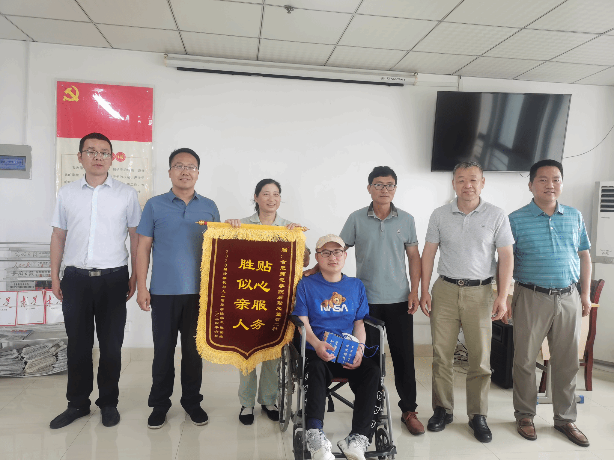 6月11日下午,2020届计算机与人工智能学院学生张金杰同学及家人向后勤赠送锦旗,上书“贴心服务 胜似亲人”。后勤班子热情接待了张金杰及家人,并与他们进行了亲切的交谈,并祝愿他在创业的道路上大展鸿图。