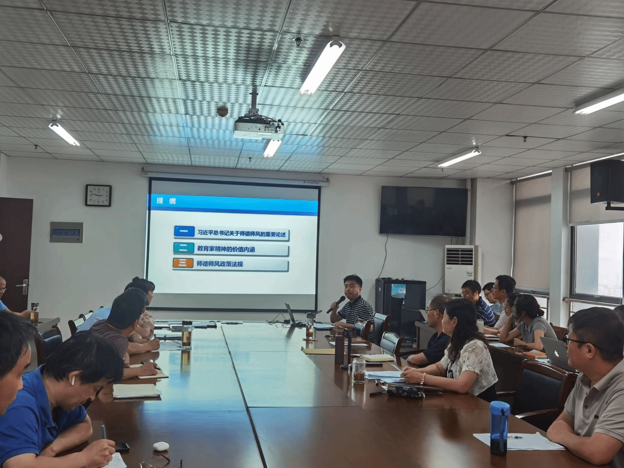 6月19日下午,数学与统计学院在行知楼1102会议室开展了“行知路上大家谈”第十期活动。此次为更好推进党纪学习教育,进一步引导教师深刻领会教育家精神的核心内涵,引导广大教师增强法治意识,坚守师德底线,涵养高尚师德,学院邀请“全国优秀教师”称号获得者、学院副院长、纪委委员黄浩副教授作《学习践行新时代师德规范 大力弘扬践行教育家精神》报告。活动由党委书记穆娟主持,学院全体教职工参加。