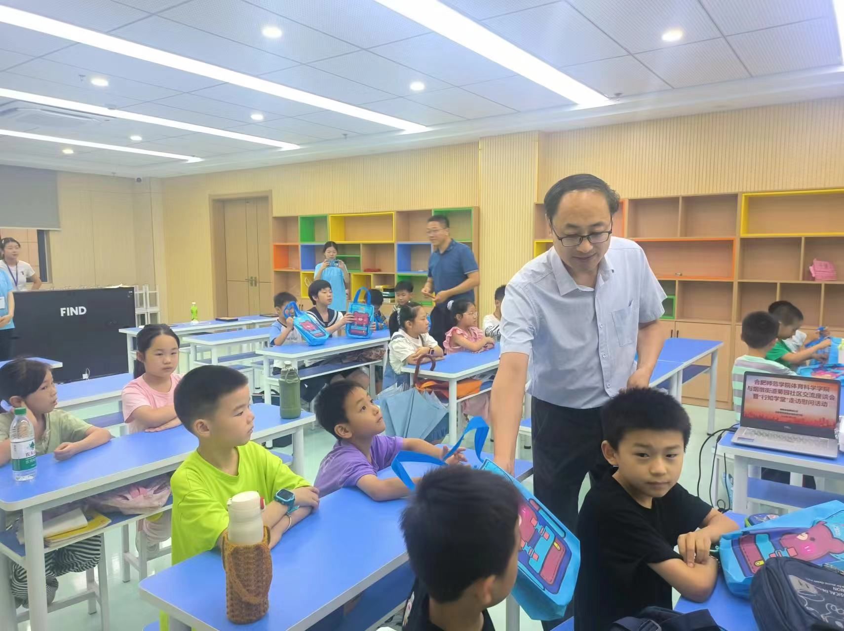 7月12日下午,体育科学学院党委书记赵波、副书记王飞、团委书记高光健及指导教师肖如意一行到菊园社区行知学堂看望慰问“小先生”和小学员们。