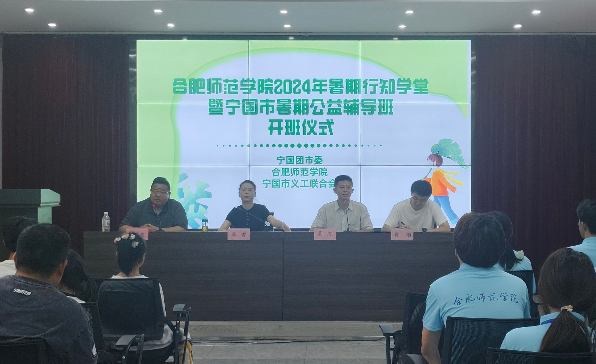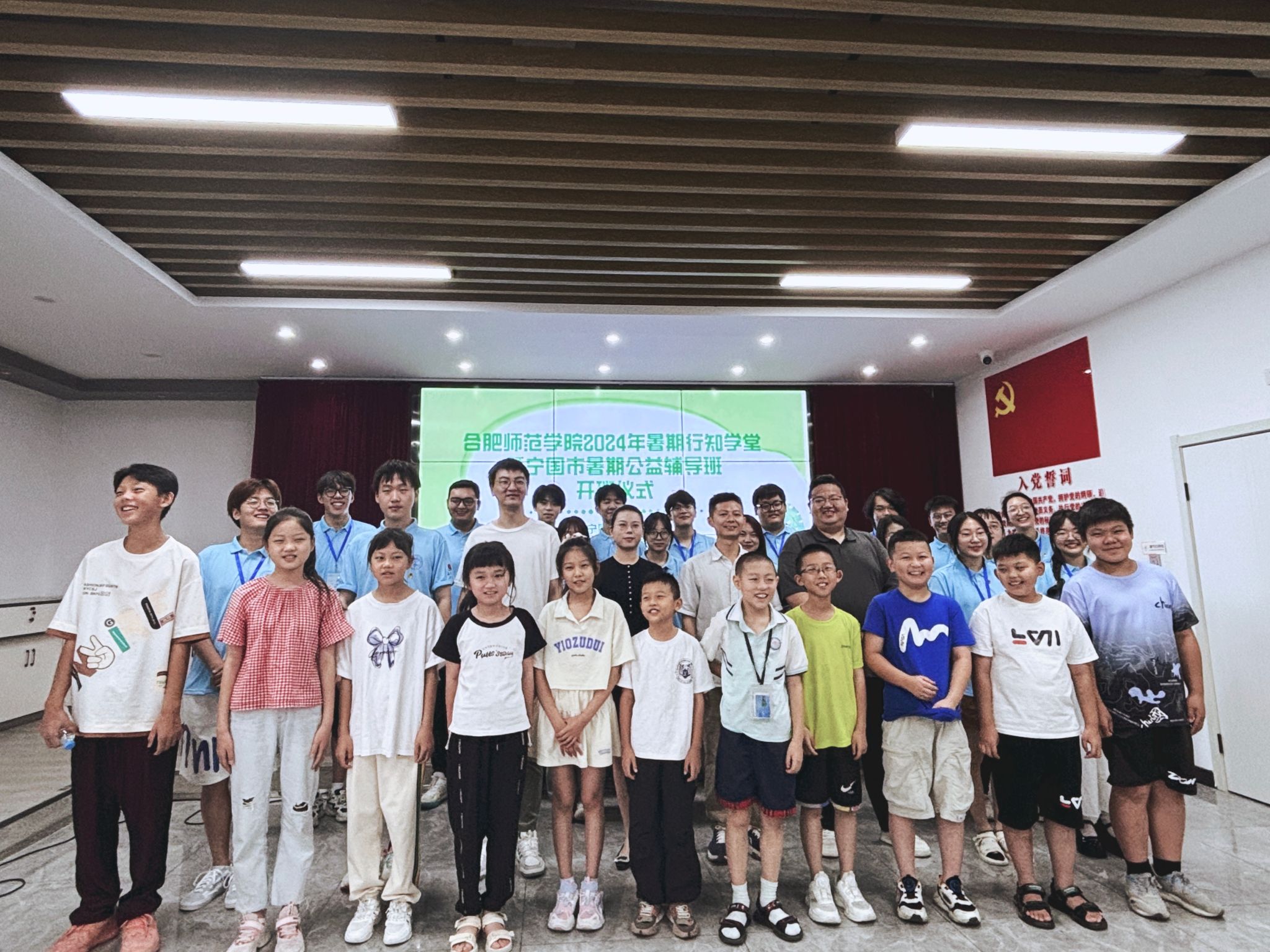 7月10日,院团委宁国行知学堂顺利开班。宁国团市委副书记李雪、beat365在线唯一官网团委兼职副书记吴杰、宁国市义工联合会会长桂清泉、宁国市委社会工作部志愿服务工作负责人郭雨及“小先生”和小学员参加开班仪式。