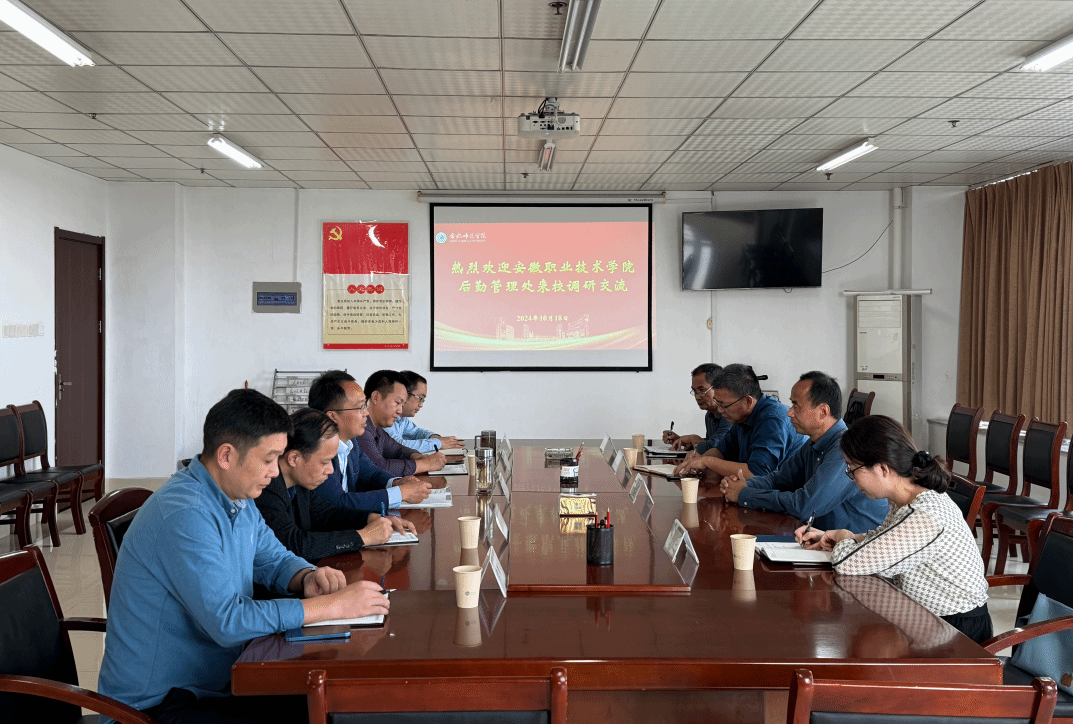 10月18日上午,安徽职业技术学院后勤管理处处长许兴旺一行4人来学院调研交流,后勤处(基建办)处长李建礼、副处长丁言浩和相关科室同志参加会议。