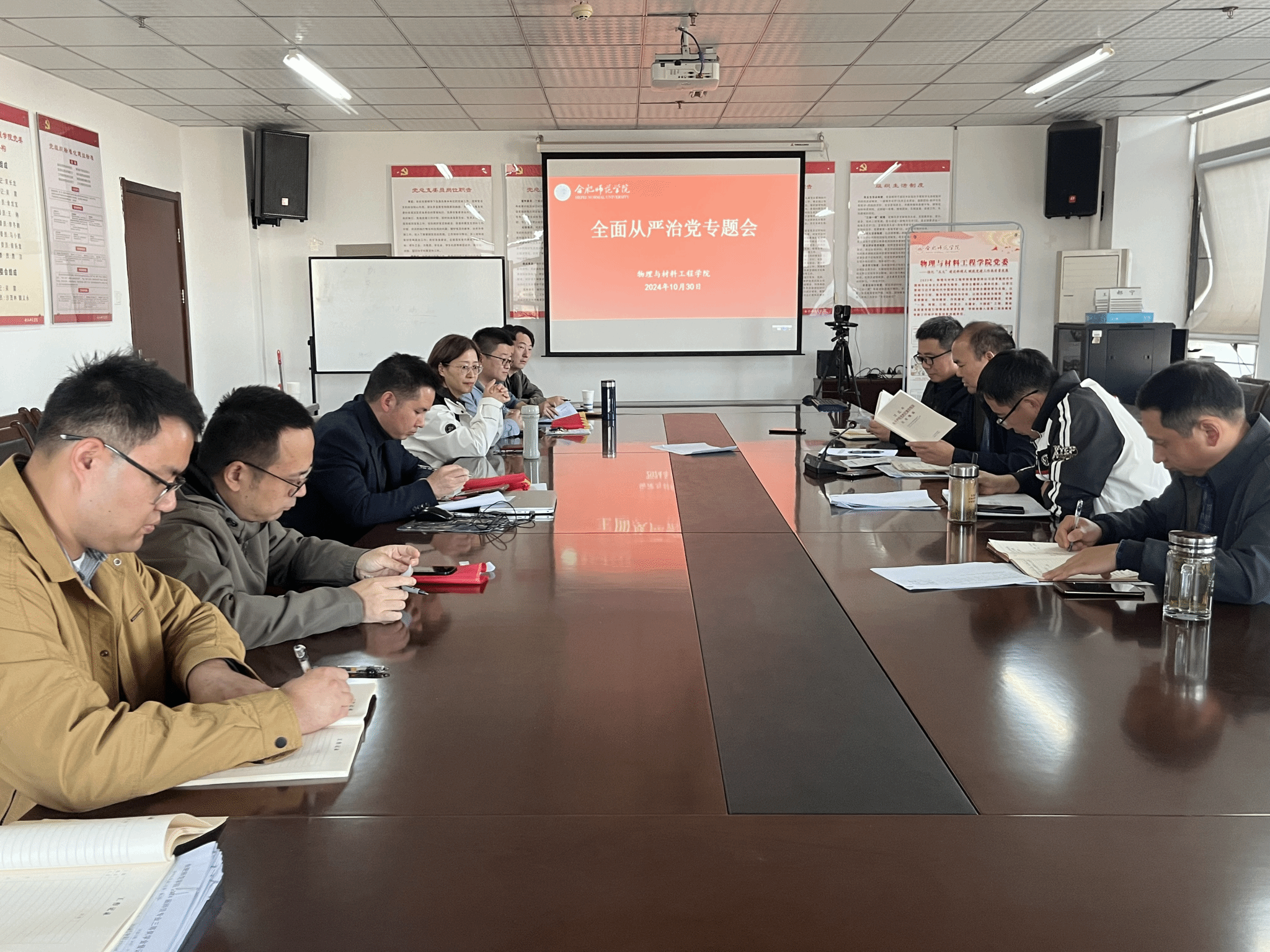 10月30日下午,物理与材料工程学院党委在行知楼1202会议室召开2024年下半年全面从严治党专题工作会议,学院党委班子全体成员参加会议,系部主任、支部书记、辅导员等列席会议。会议由党委书记吴长龙主持。