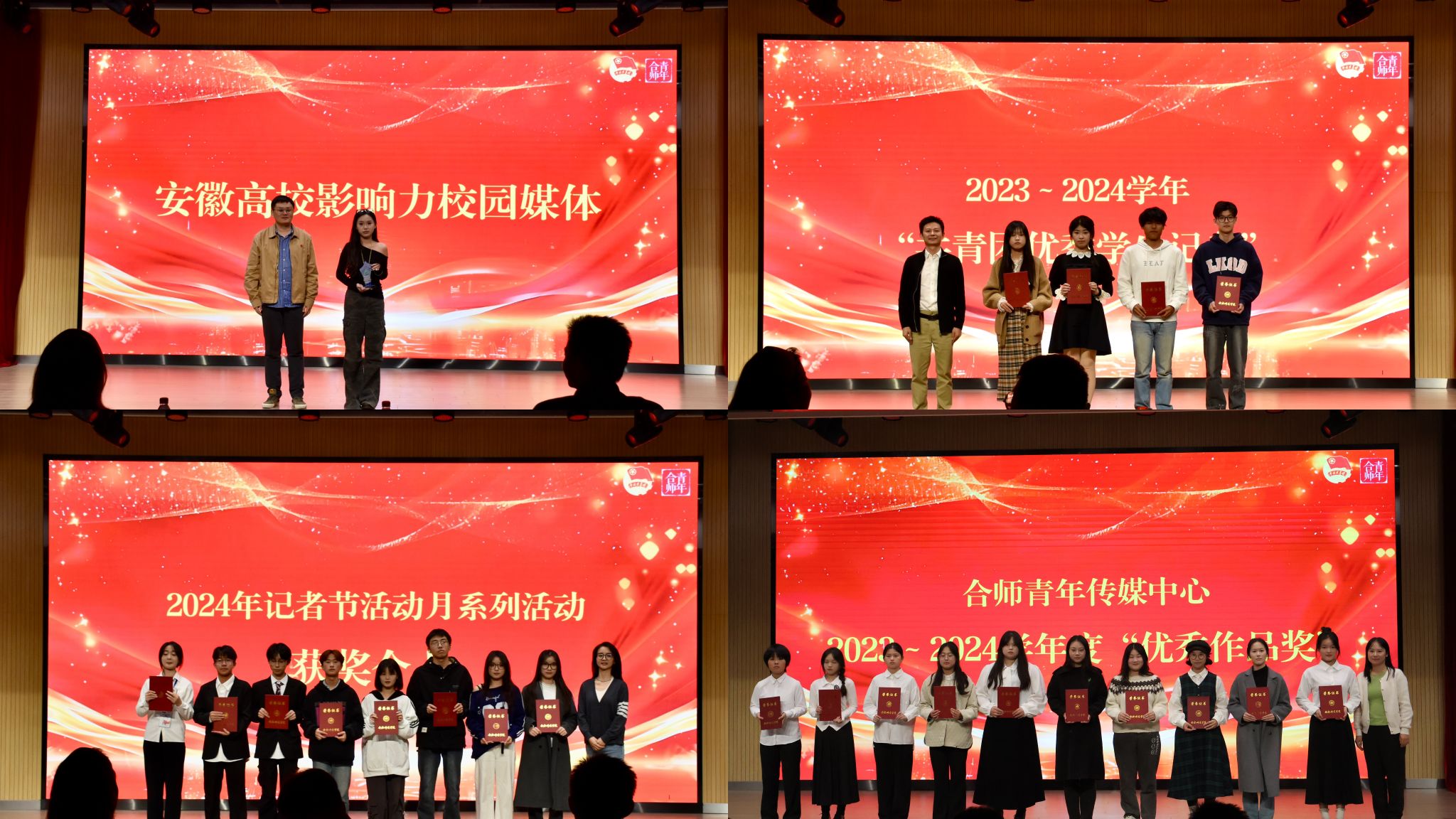 晚会现场还为安徽高校影响力校园媒体、2023-2024学年“共青团优秀学生记者”、2024年记者节活动月系列活动获奖个人、第六期校园媒体学生干部培训班“优秀学员”以及合师青年传媒中心2023-2024学年度“优秀作品奖”获奖组织和个人颁奖;播放了合师青年传媒中心宣传片《合师青年,“媒”你不行》;开展了“飞花令”“抢凳子”等游戏活动。