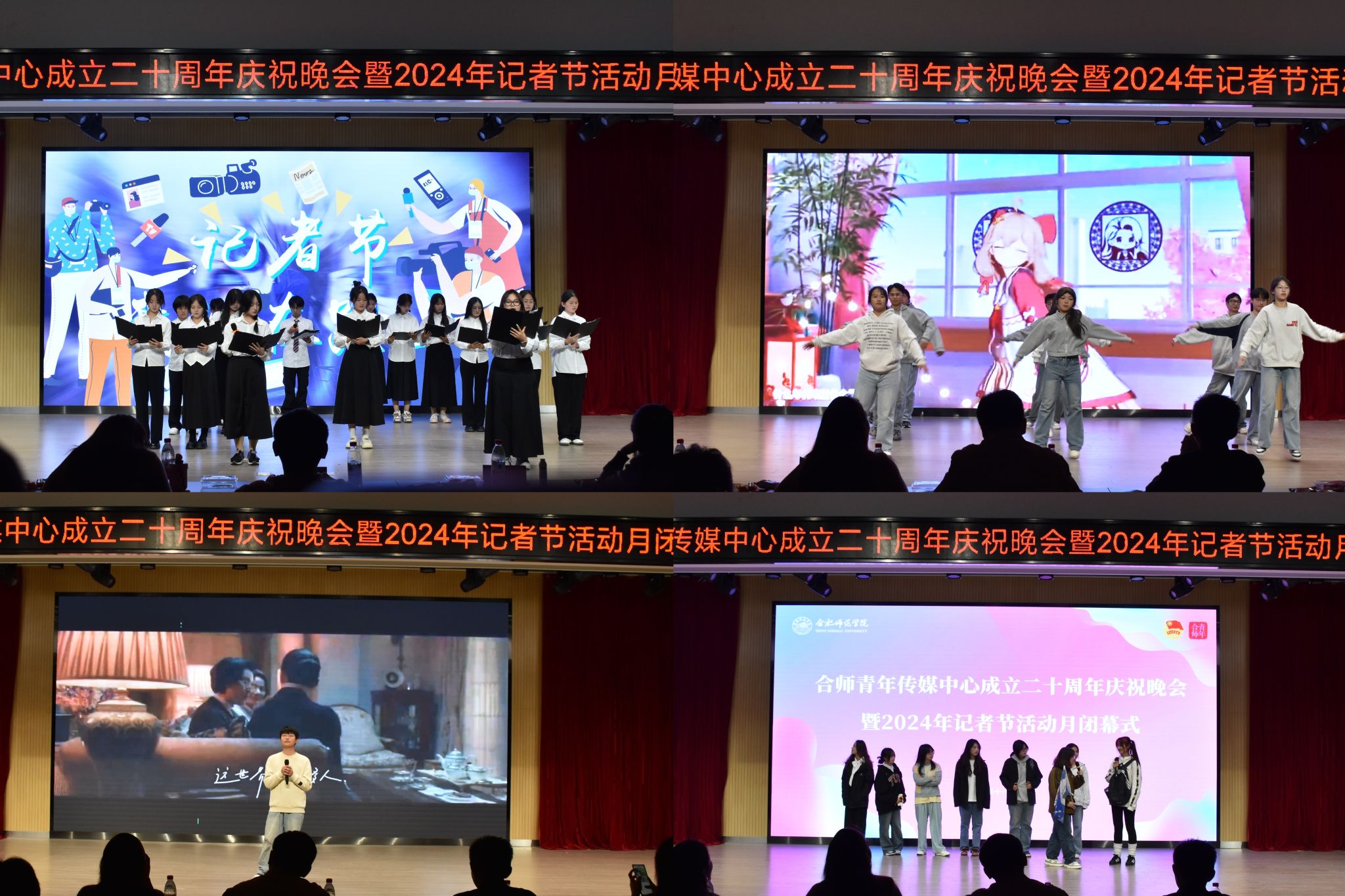 11月8日是第二十五个中国记者节。当晚七时,由院团委主办、合师青年传媒中心承办的合师青年传媒中心成立二十周年庆祝晚会暨2024年记者节活动月闭幕式在锦绣校区大学生活动中心顺利举行。宣传部、学工部、院团委、美术与设计学院相关教师,历届“合师青年”主要负责人代表,第二十届合师青年传媒中心全体成员,校级学生组织主要负责人等200余人到场观看。