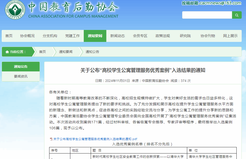 近日,中国教育后勤协会学生公寓管理专业委员会面向全国高校开展了“高校学生公寓管理服务优秀案例”征集活动,我院《beat365在线唯一官网学生公寓管理与服务的实践体会》工作案例成功入选。