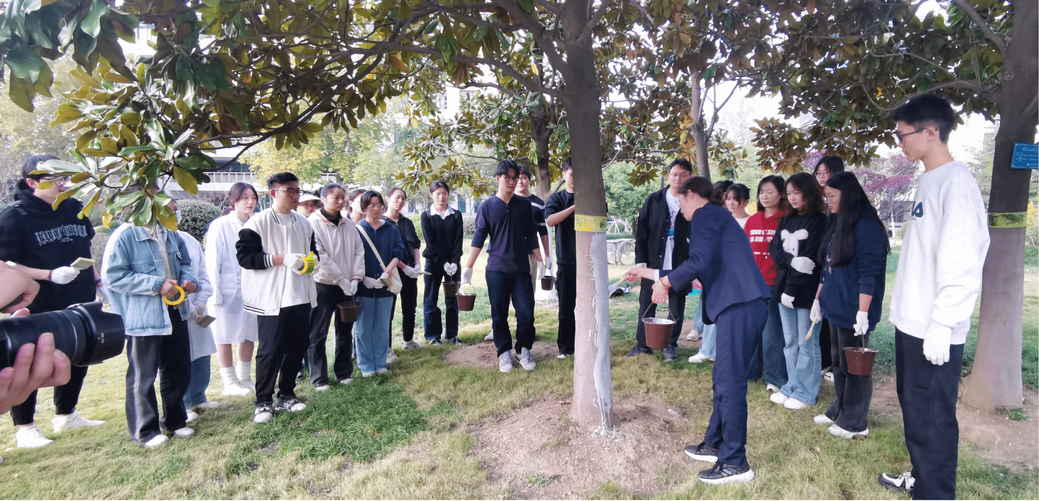 校园物业服务中心的指导老师王培培为同学们详细讲解了园林养护相关知识、树木“刷白”的要领并做了示范,强调了在劳动中的安全注意事项,为同学们发放劳动工具。同学们分成不同小组,带着手套、水桶、石灰、刷子等工具井然有序地开始劳动。活动现场,大家合作默契、干劲十足,发扬不怕脏不怕累的精神,认真对每棵树木进行规范涂刷,即使涂料溅到手上、衣服上,也丝毫不影响大家劳动的热情,一次次的弯下腰,又一次次的起身……27名同学,忙忙碌碌1个小时,为行知广场北侧紫薇树、桂花树、广玉兰等树木都穿上了整齐划一的“防虫衣”,期待着来年春暖花开、花团锦簇……