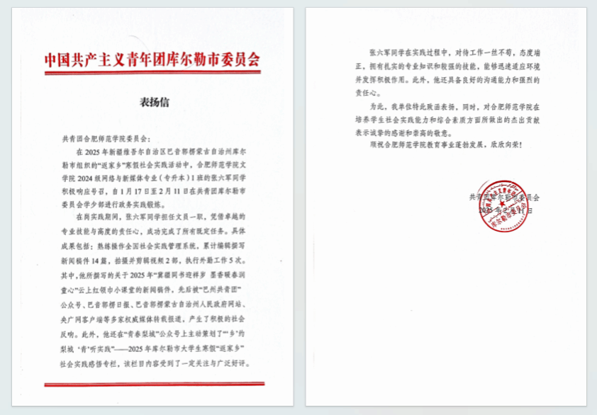 张六军心系家乡,主动联系,被新疆维吾尔自治区巴音郭楞蒙古自治州共青团库尔勒市委员会录用,至学少部进行为期1月的政务实践锻炼。在实践期间,他累计编辑撰写各类宣传稿件14篇,拍摄并剪辑视频2部,高效执行外勤工作5次。其中,他所策划的“乡”约梨城 “青”听实践——2025年库尔勒市大学生寒假“返家乡”社会实践感悟专栏,在“青春梨城”公众号发布后,获得广泛关注与好评;所撰写的关于2025年“云上红领巾小课堂”的新闻稿件,被“巴州共青团”公众号、巴音郭楞蒙古自治州人民政府网站,巴音郭楞日报、央广网客户端等多家权威媒体转载报道,产生了积极的社会影响。实习结束后,库尔勒团市委向学校发来表扬信,信中表示,张六军凭借扎实的专业技能与高度的责任心,圆满完成了多项任务,其表现充分体现了beat365在线唯一官网文学院在培养学生实践能力和综合素质方面的成效,展现了新时代青年的担当与风采。