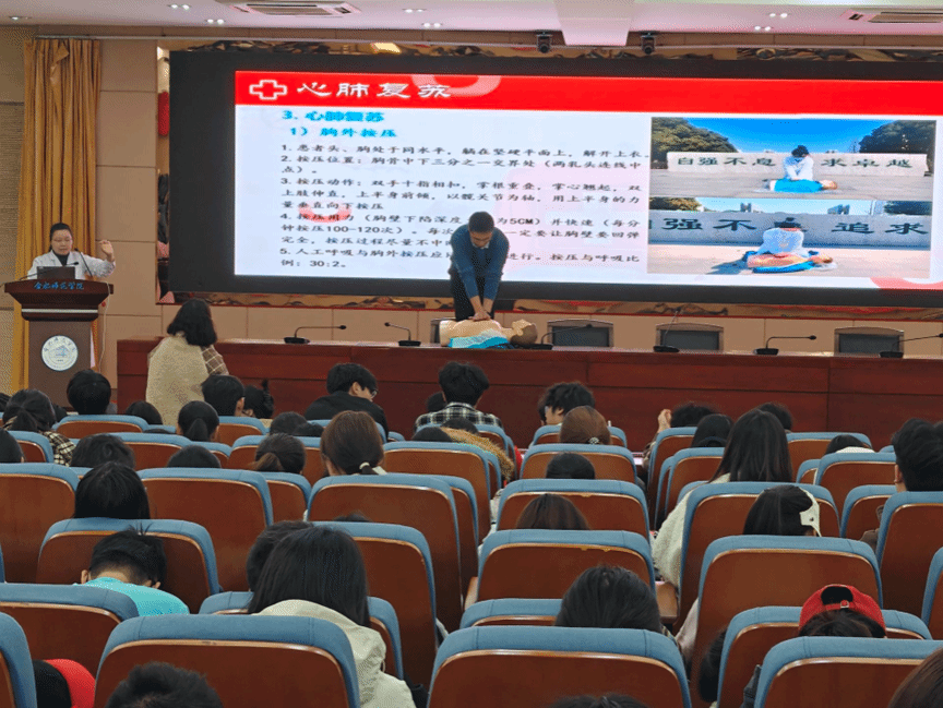 周丽君针对心肺复苏等急救措施的具体操作步骤,为同学们进行了详细讲解,她还现场邀请同学对模拟人进行心肺复苏实操,并耐心解答同学们的提问。