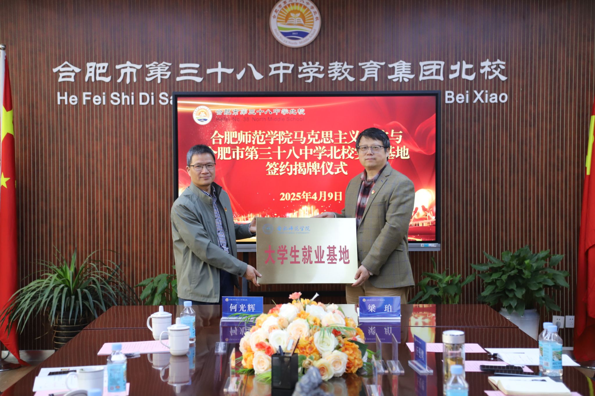 期间,何光辉代表学院与合肥市第三十八中学北校签订了大学生就业基地协议,双方举行了共建就业基地的授牌仪式。