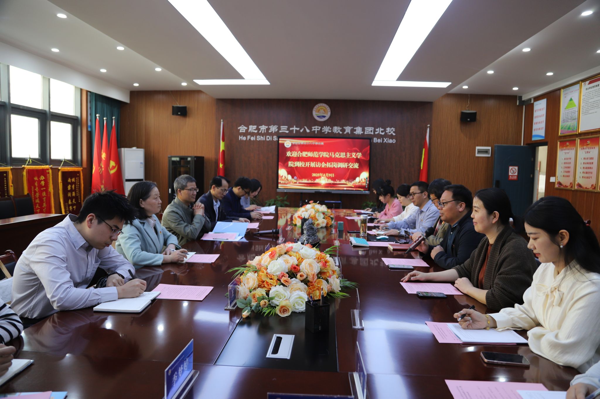 为进一步推动校校合作,助力学院毕业生高质量就业,4月9日上午,马克思主义学院院长何光辉、副院长方政、习近平新时代中国特色社会主义思想概论教研室主任张军占等一行7人前往合肥市第三十八中学北校开展访校拓岗促就业活动,受到合肥市第三十八中学党支部书记、校长梁珀,党支部副书记、副校长宣守西等热情接待。