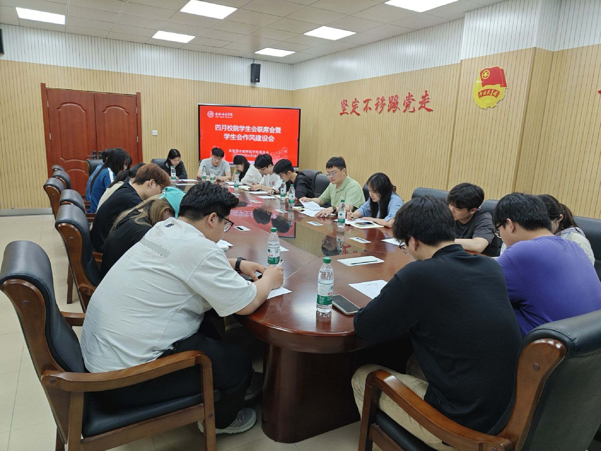 4月28日中午,2025年4月校院学生会联席会暨学生会作风建设专题学习会在锦绣校区共青之家会议室召开,院团委书记刁文彬、院团委魏晓倩、院学生会主席团成员及各二级学院学生会春季执行主席参加会议。