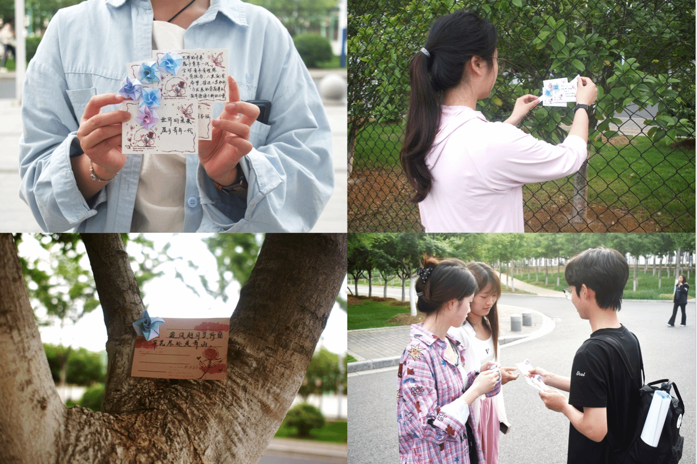 五四青年节前夕,由院团委主办、合师青年传媒中心承办的“玫瑰寄语青年”活动在锦绣校区和滨湖校区开展。从路牌到路灯,从墙壁到座椅,从图书馆到教室,300张“玫瑰明信片”放置于校园的各个角落陆续被同学们发现。