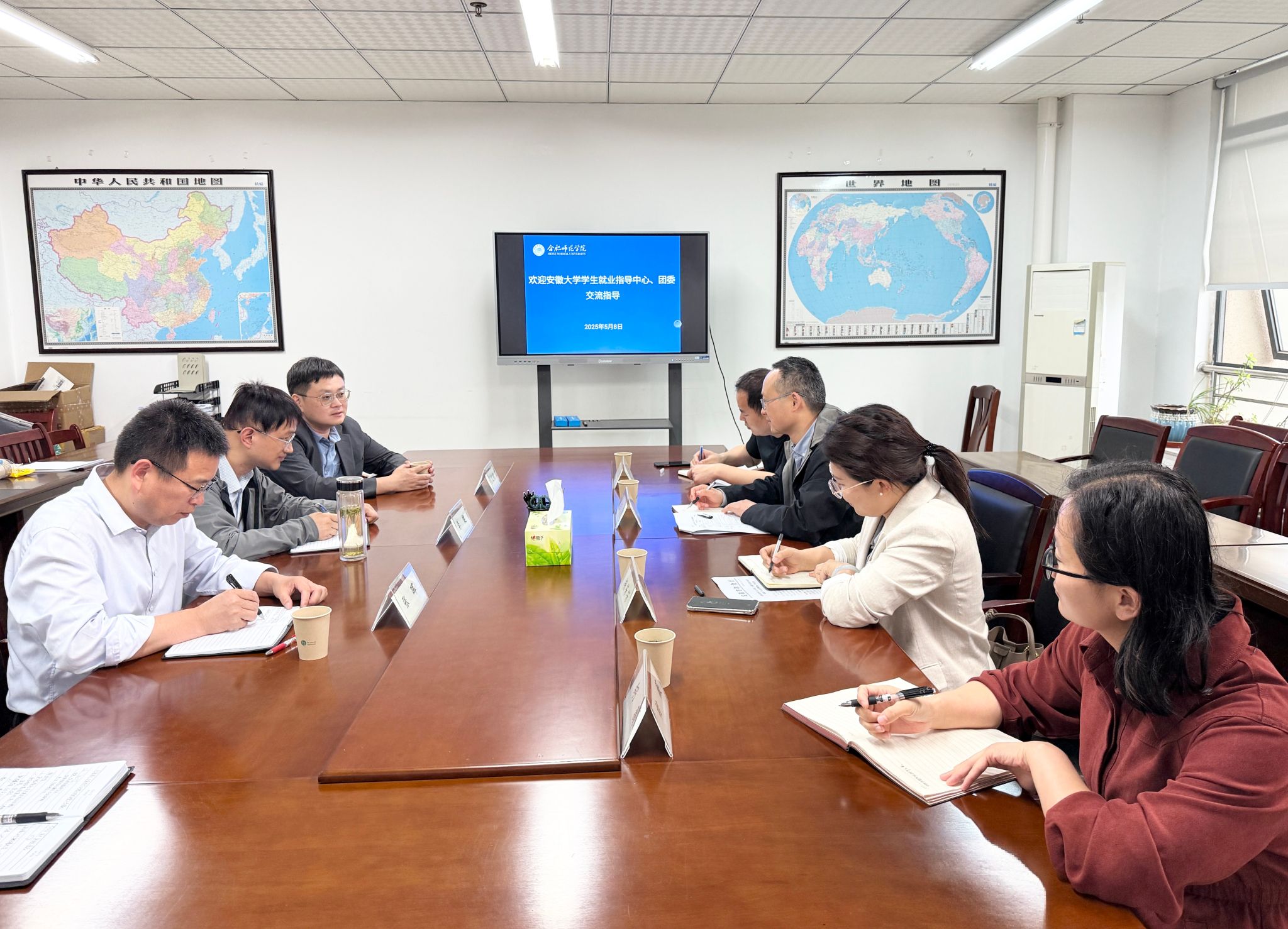 5月8日下午,安徽大学学生就业指导中心主任王超、团委副书记胡芳芳一行来校调研交流毕业生就业工作。beat365官网就业创业工作处处长李健主持交流会,团委书记刁文彬、就业创业工作处副处长张晖及相关科室负责人参加座谈。