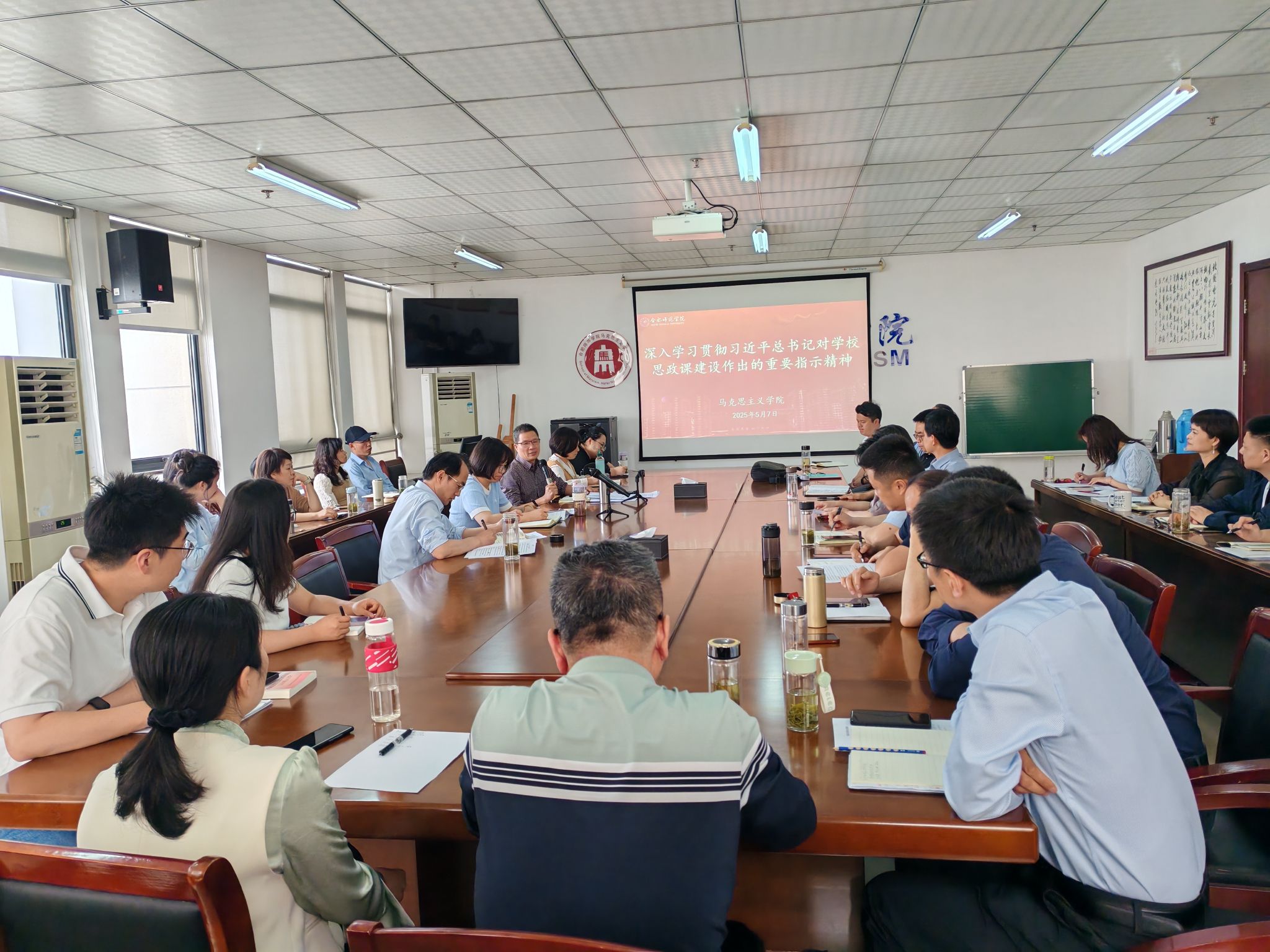 5月7日下午,在行知楼1610会议室,马克思主义学院组织全体思政课教师重温习近平总书记对学校思政课建设重要指示精神,深入学习、全面把握、深刻领会重要指示精神,认真落实中央、教育部和安徽省关于思政课建设相关要求,并对学院思政课建设工作进行再动员、再部署、再推进。