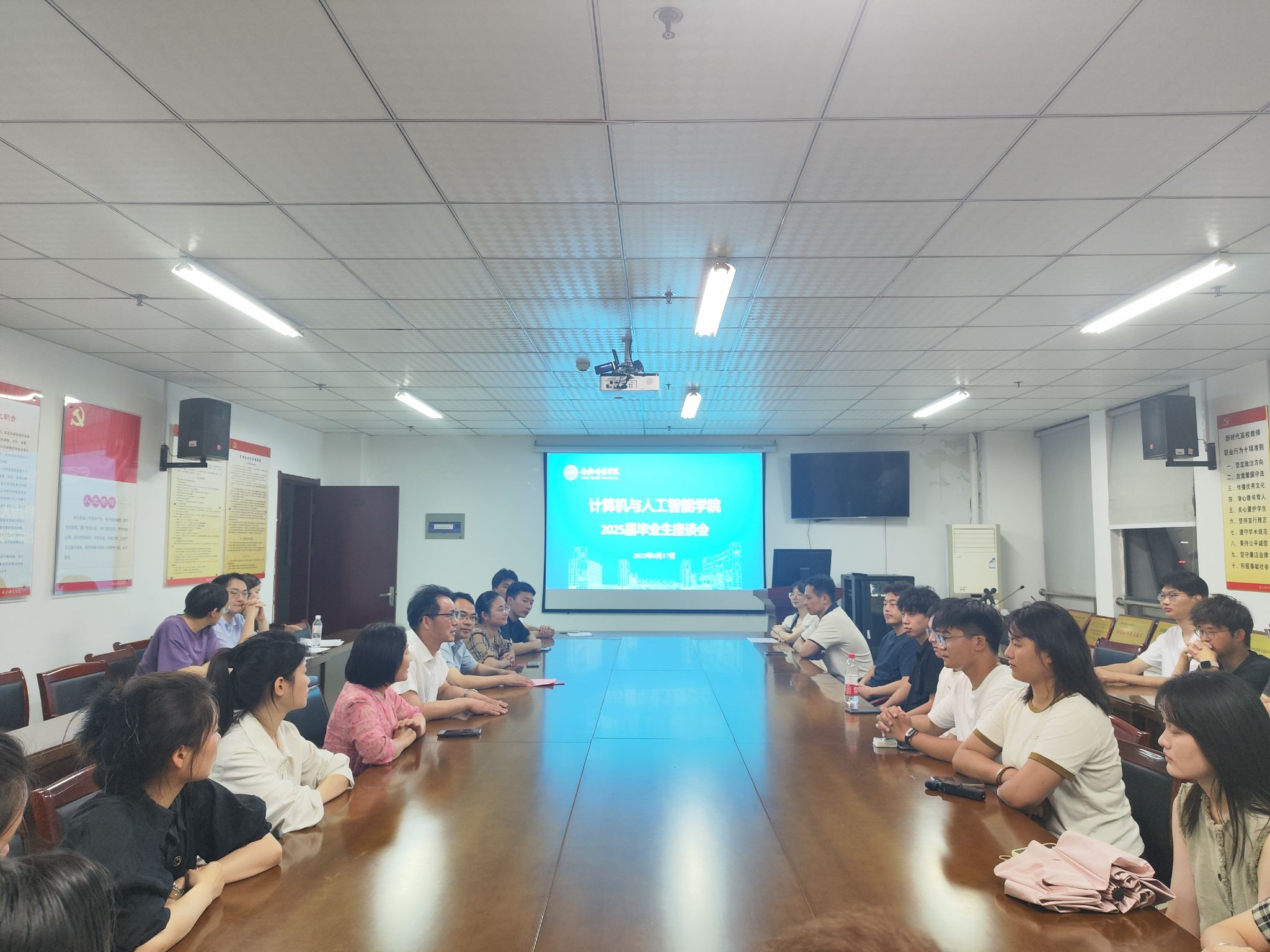 学院高度重视毕业生思想政治教育工作,通过多种形式强化理想信念教育。6月9日,各学生党支部组织毕业班党员开展“重温入党誓词”活动,勉励毕业班党员牢记党员身份,在未来的工作和学习中继续发挥先锋模范作用。6月18日,2025届毕业生座谈会在行知楼1302举行,学院党政领导班子、辅导员与毕业生代表深入交流,倾听他们对学院发展的建议,并鼓励他们在专业领域勇攀高峰,不懈奋斗,勇敢前行。