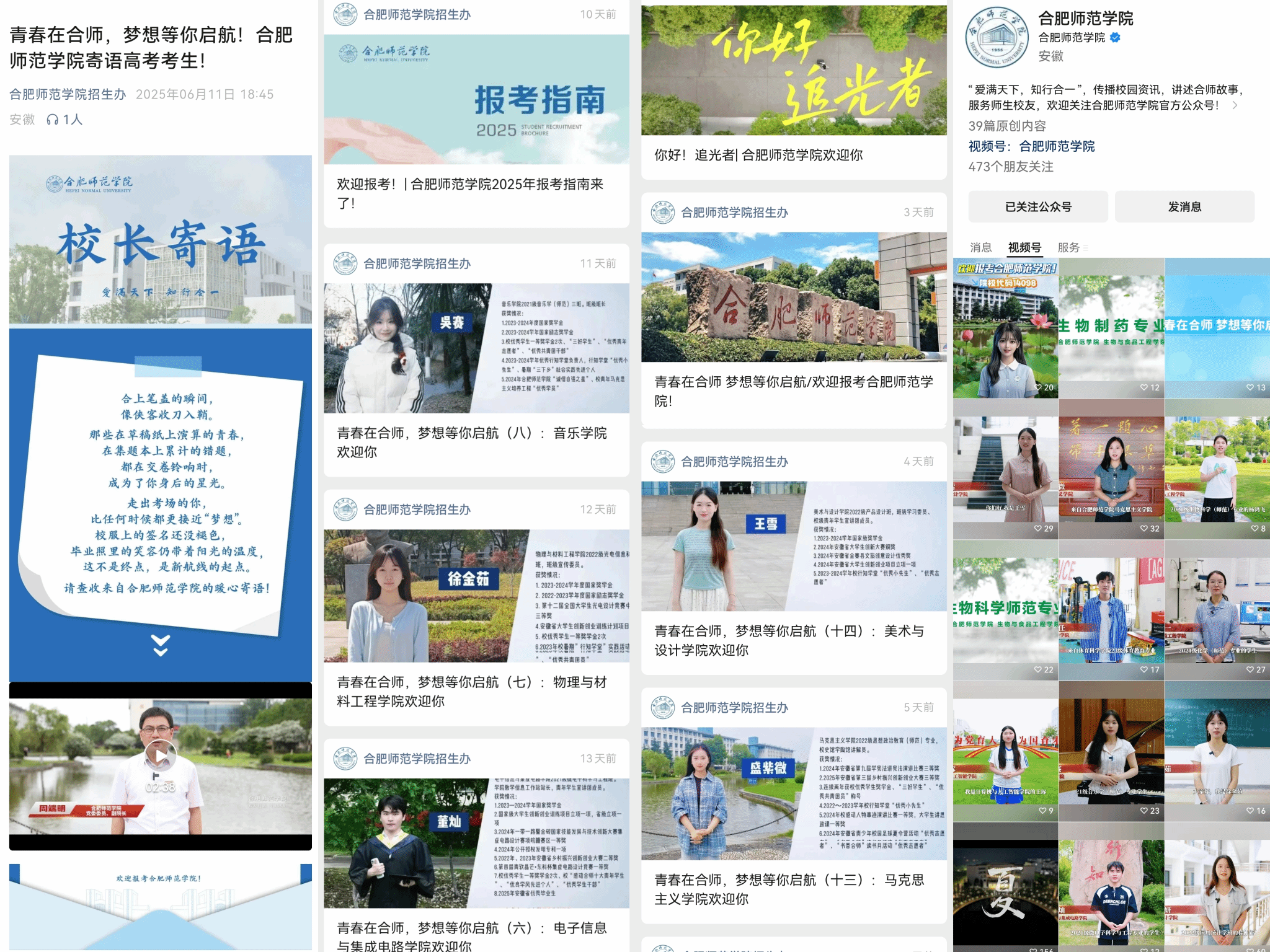优化“多张网”,全景展示校园文化。在宣传部、学生工作处、就业创业工作处、校团委等相关部门以及各二级学院的大力支持下,及时通过网站、公众号、视频号等平台发布招生宣传信息。通过学院招生简章、“校长对你说”“青春在合师,梦想等你启航”15期学长学姐带你看专业系列招生宣传视频等模块就招生政策、专业介绍、学科平台、师资队伍、科学研究、社会服务、学生风采、毕业生考研就业等考生关注的热点内容进行了全方位宣介;联合学院官微、招生办公众号、招生办小程序、合师学工、合师青年、二级学院公众号等集中推送招生相关视频和讯息,5月份以来发布原创招生宣传文章30余篇。