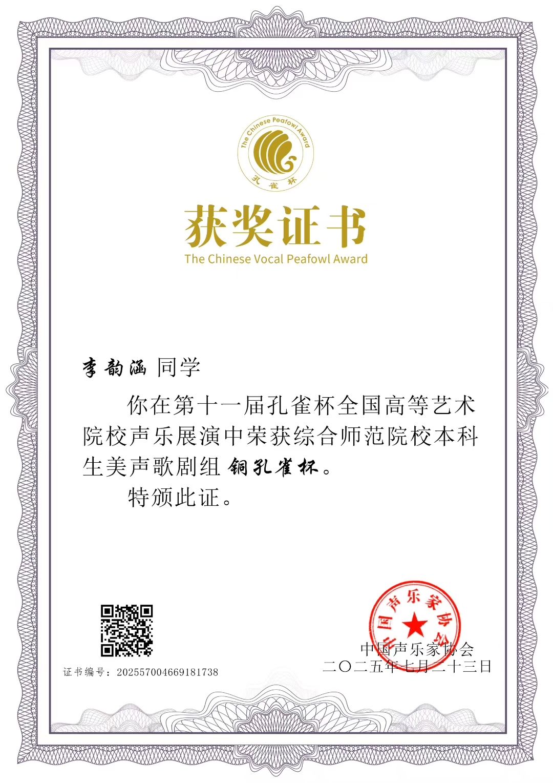 7月23日,从第十一届孔雀杯全国高校声乐展演现场传来喜讯,音乐学院2022级的李韵涵同学凭借出色表现,在综合师范院校本科美声歌剧组的激烈竞争中脱颖而出,斩获铜孔雀奖。