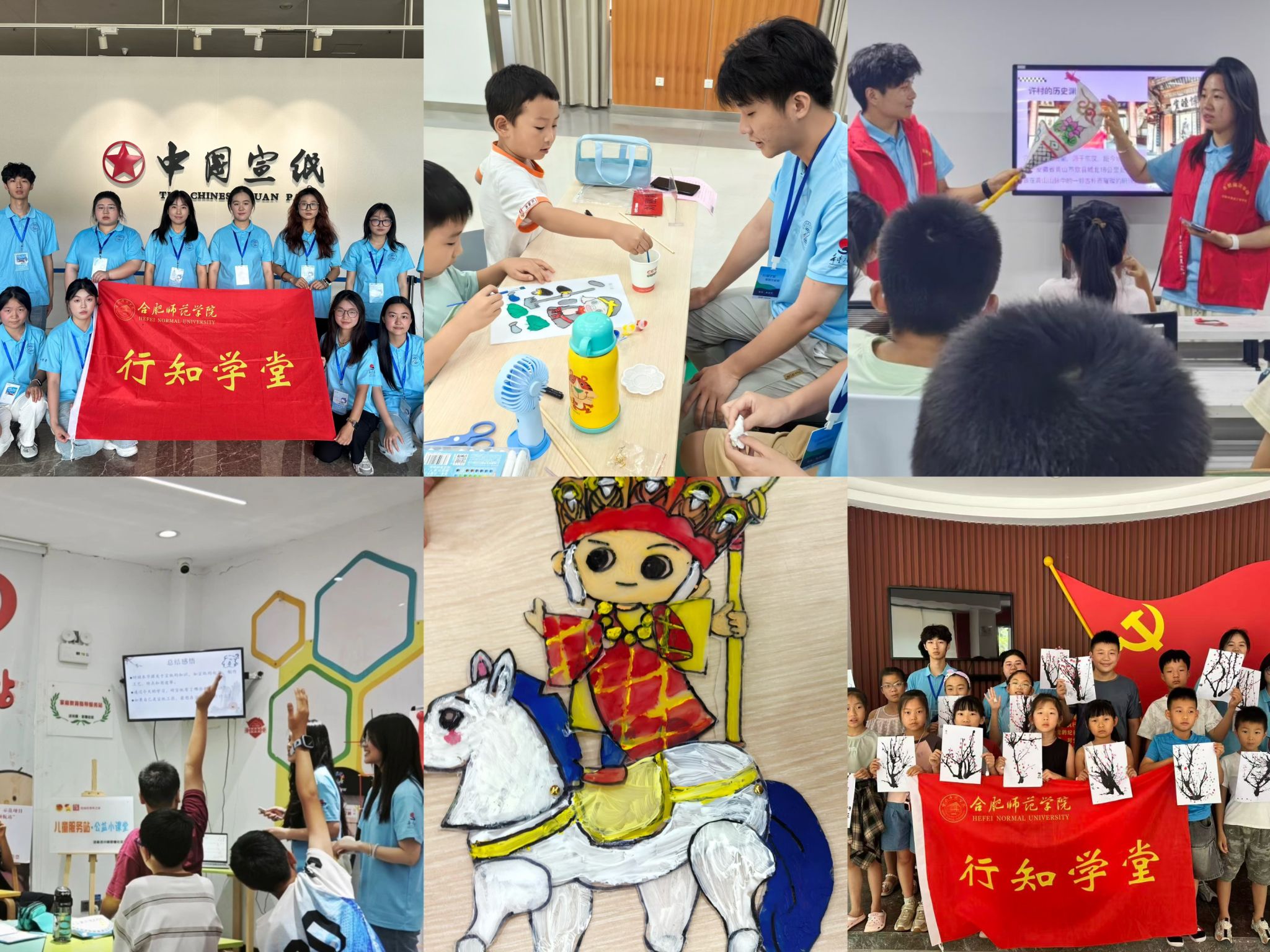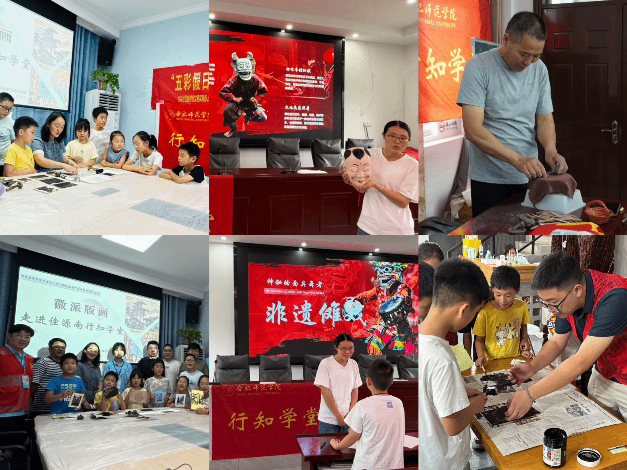 今年暑期,全校各暑期“三下乡”社会实践团队依托“行知学堂”平台,以“非遗润童心,技艺传薪火”为主题,将宣纸工艺、徽派版画、中华武术、池州傩戏、皮影戏等十余项非遗项目搬进课堂,通过邀请非遗传承人走进学堂、实地参观教学和开设专题工艺课程等方式,开展了一系列沉浸式体验与互动教学,让“小先生”与小学员们近距离了解、学习、传承传统文化,为非遗传承注入青春活力。