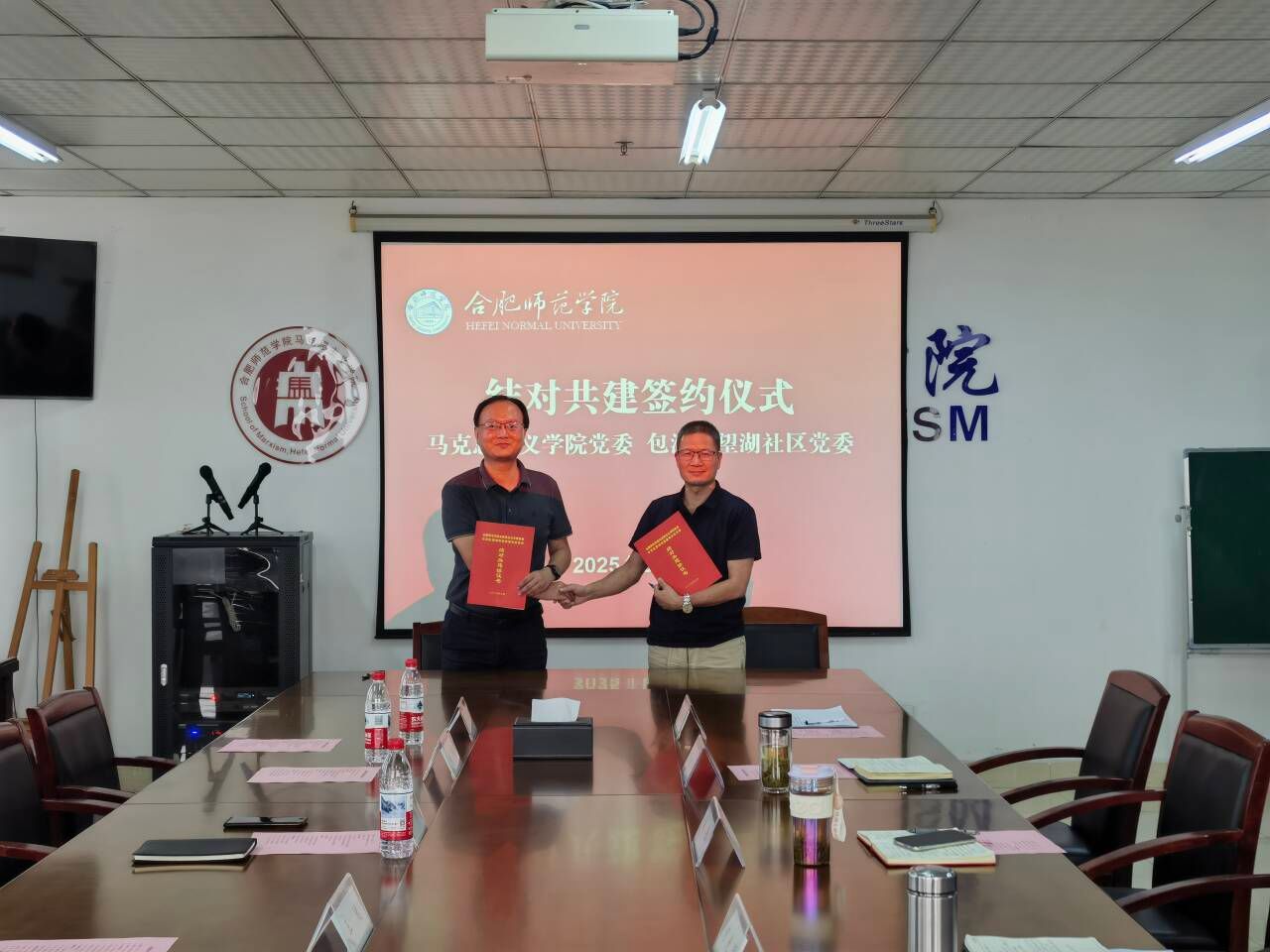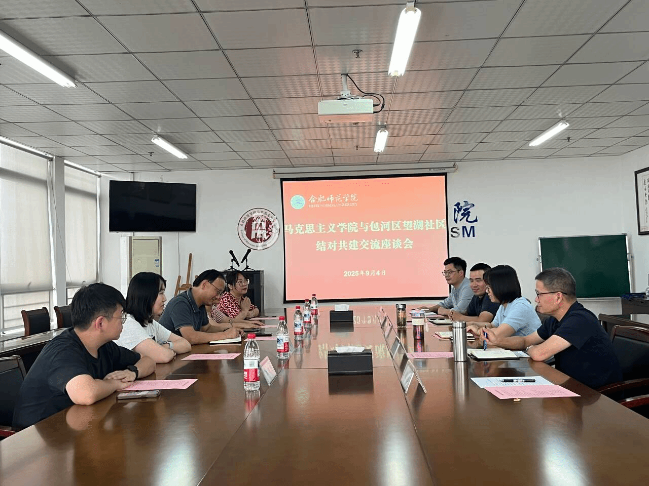 为加强校地党建深度融合,激发结对共建新活力,8月4日下午,合肥市包河区望湖社区党委书记王栋一行到访马克思主义学院,双方进行交流座谈并签订合作协议。院党委书记刘艳、院长何光辉及党员代表参会。会议由党委副书记吴世红主持。