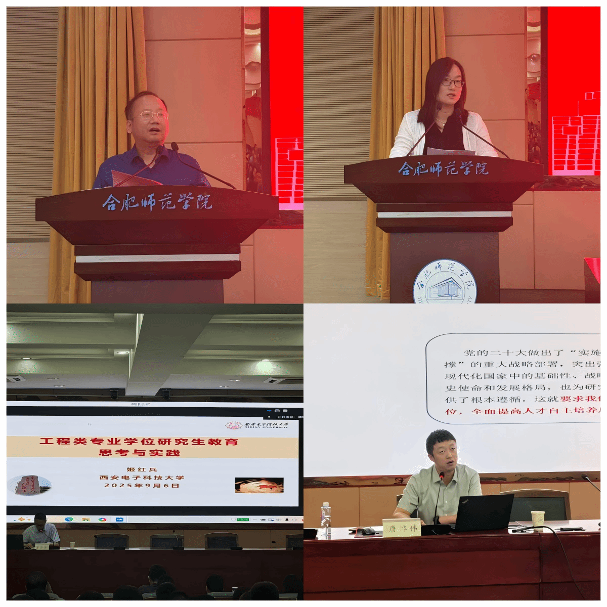 聘书颁发仪式后开展了两场专题讲座。全国工程专业学位研究生教育指导委员会委员、西安电子科技大学博士生导师姬红兵教授以“工程类专业学位研究生教育思考与实践”为题,从学科专业内涵、教育政策动向、学科建设内容、专业学位需求背景、培养方案制定、质量保证体系建设等方面系统介绍工程专业学位研究生教育的相关政策、基本特征、改革要求等,并结合西安电子科技大学开展工程专业学位研究生教育的具体实践分享了体会与思考。教育与心理科学学院院长唐烨伟教授则以“ 构建高质量研究生教育体系,全面提升人才自主培养质量”为主题,结合实际案例,分享了研究生教育的战略意义、发展使命、改革创新,AI时代下的研究生导师、高质量研究生的培养路径等内容。