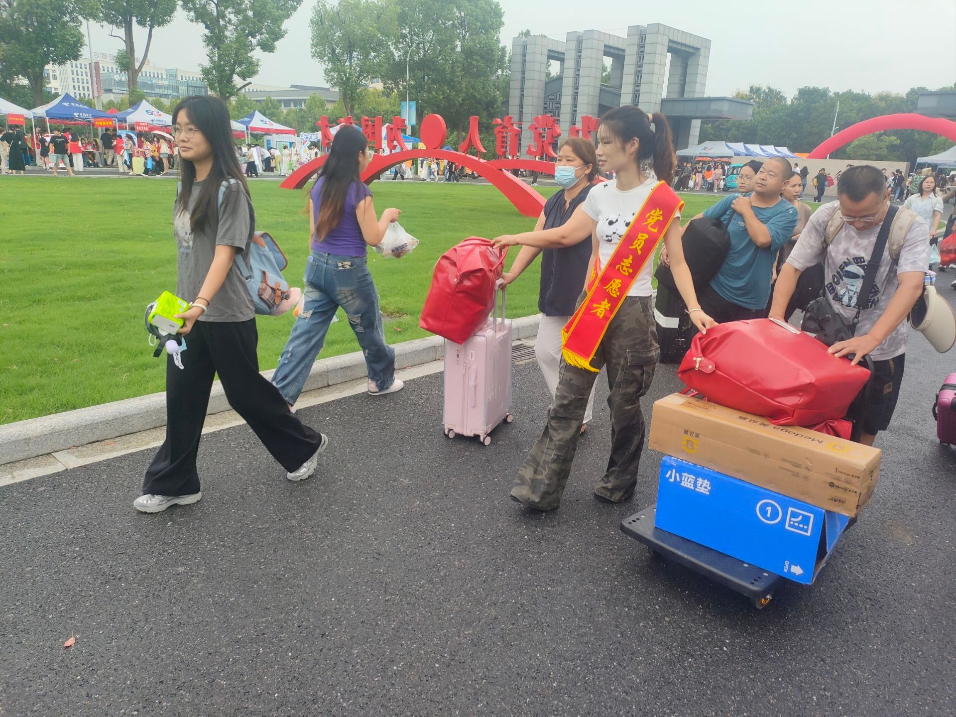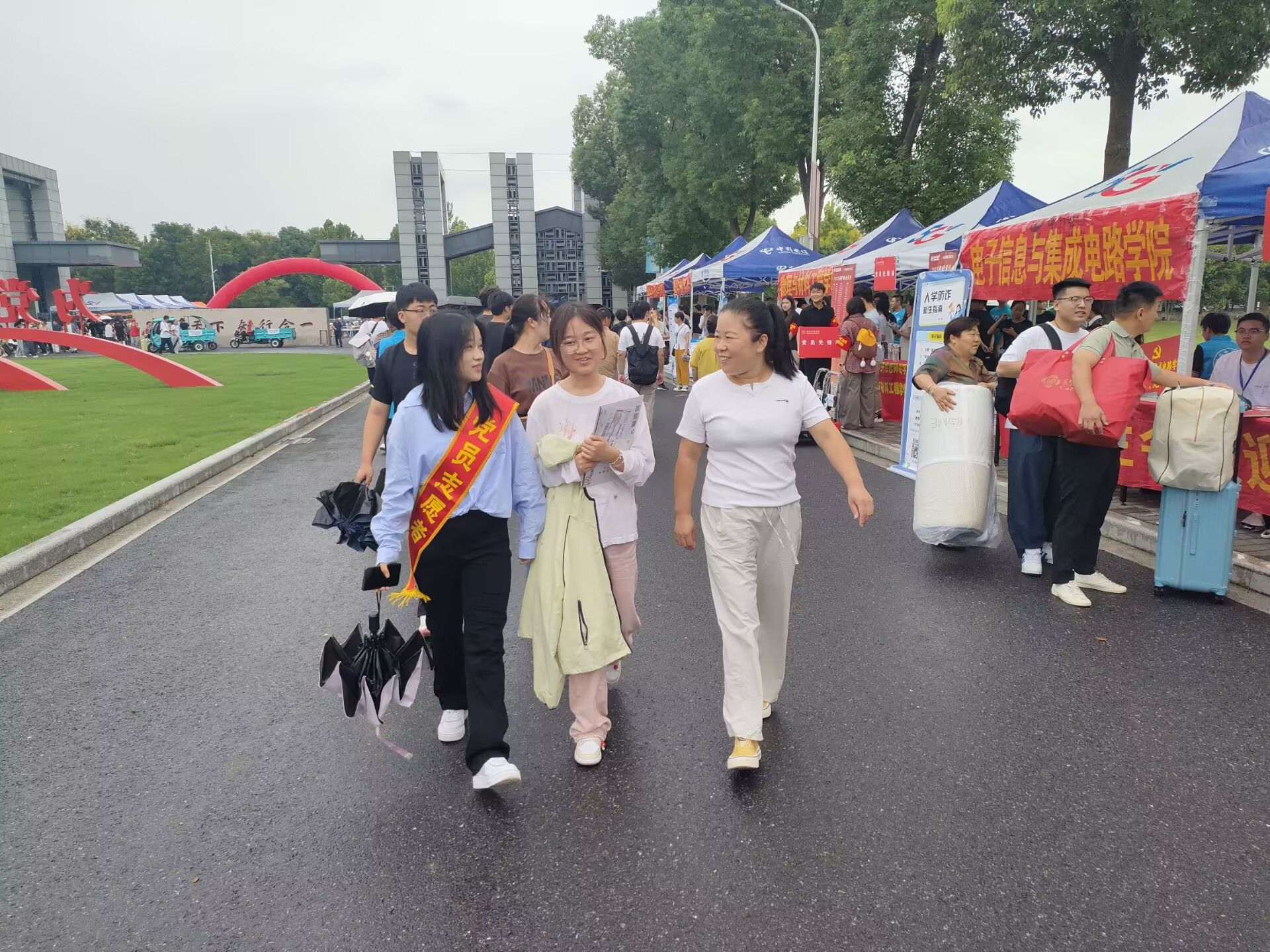 阴雨绵绵,顶风冒雨的党员志愿者们用实际行动给新生和家长们留下了深刻的印象。“同学,一路辛苦啦!来,跟我走,我带你去找报到点。”“先坐下喝口水歇一歇,有任何困难都可以找我们,我们在。”从行李搬运到路线指引,从答疑解惑到暖心鼓励,他们以实实在在的行动诠释责任,用真挚热情的服务温暖人心,让新生踏入校门的第一刻便感受到浓厚的归属感。