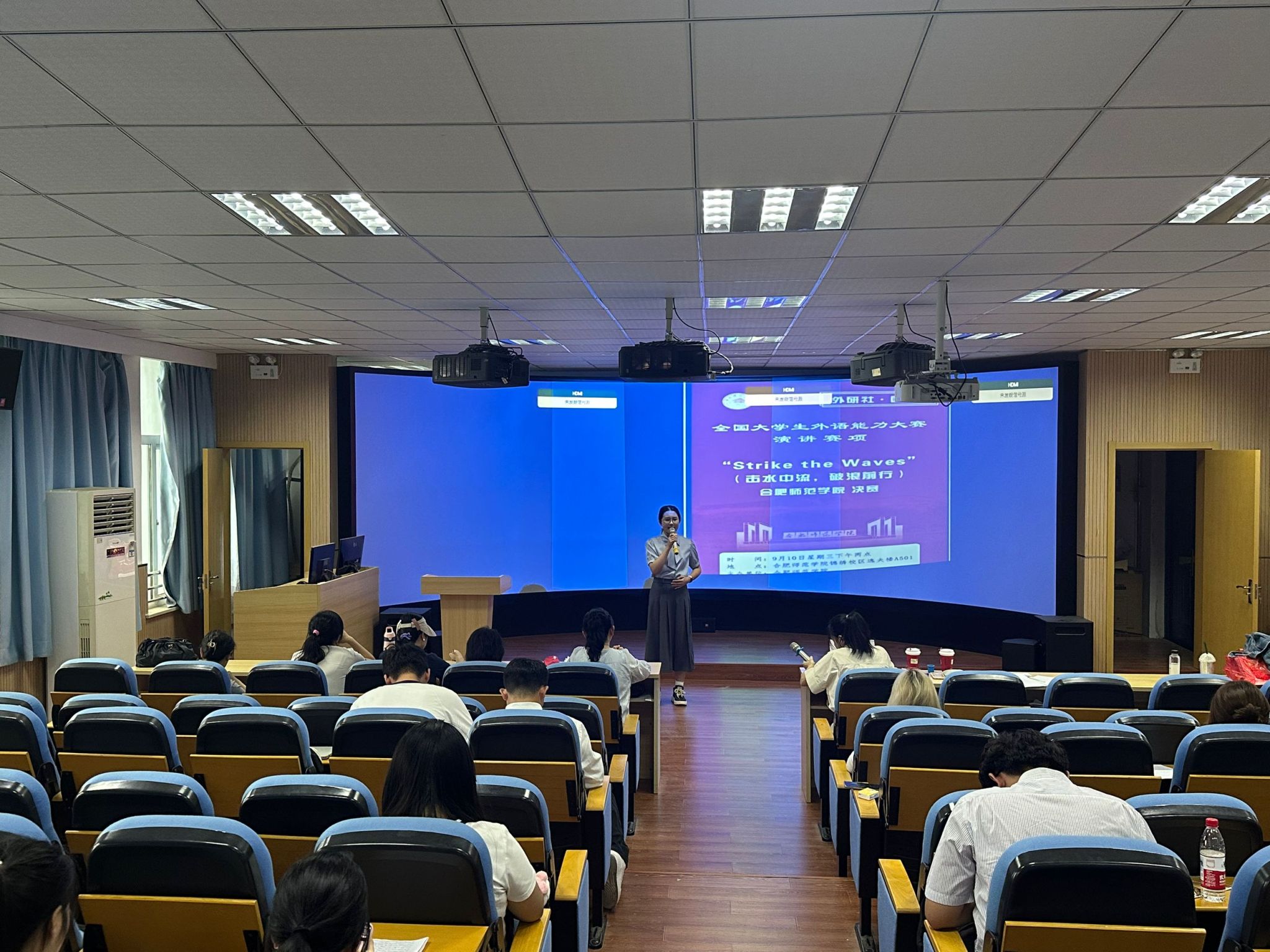 决赛现场,选手们围绕主题“Strike the Waves”进行定题演讲,即兴问答以及一分钟演讲,以清晰的逻辑、流畅的表达和自信的风貌,充分展现了beat365官网学子优秀的语言应用能力和临场应变水平。外国语学院教师担任评委,从语言质量、内容深度、表达效果等多方面进行综合评价。