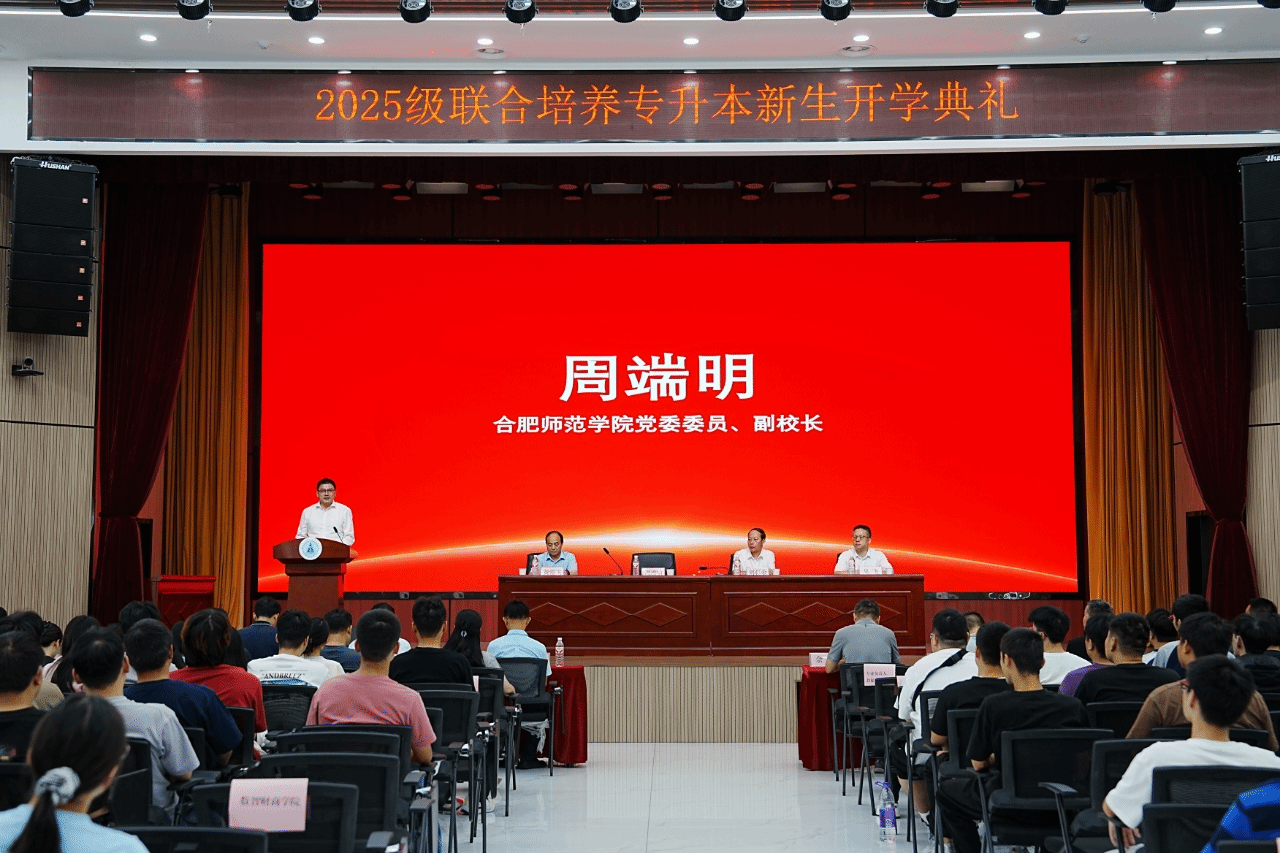 9月17日下午,beat365在线唯一官网与安徽工业经济职业技术学院联合培养专升本开学典礼在安徽工业经济职业技术学院图书馆报告厅隆重举行。beat365在线唯一官网党委委员、副院长周端明,安徽工业经济职业技术学院党委副书记、院长刘仁金,副院长黄雪飞、吴飞等领导出席典礼。两校相关职能部门和二级学院党政负责人、新生辅导员、教师代表及2025级全体专升本新生参加活动。典礼在庄严的国歌声中正式开始。