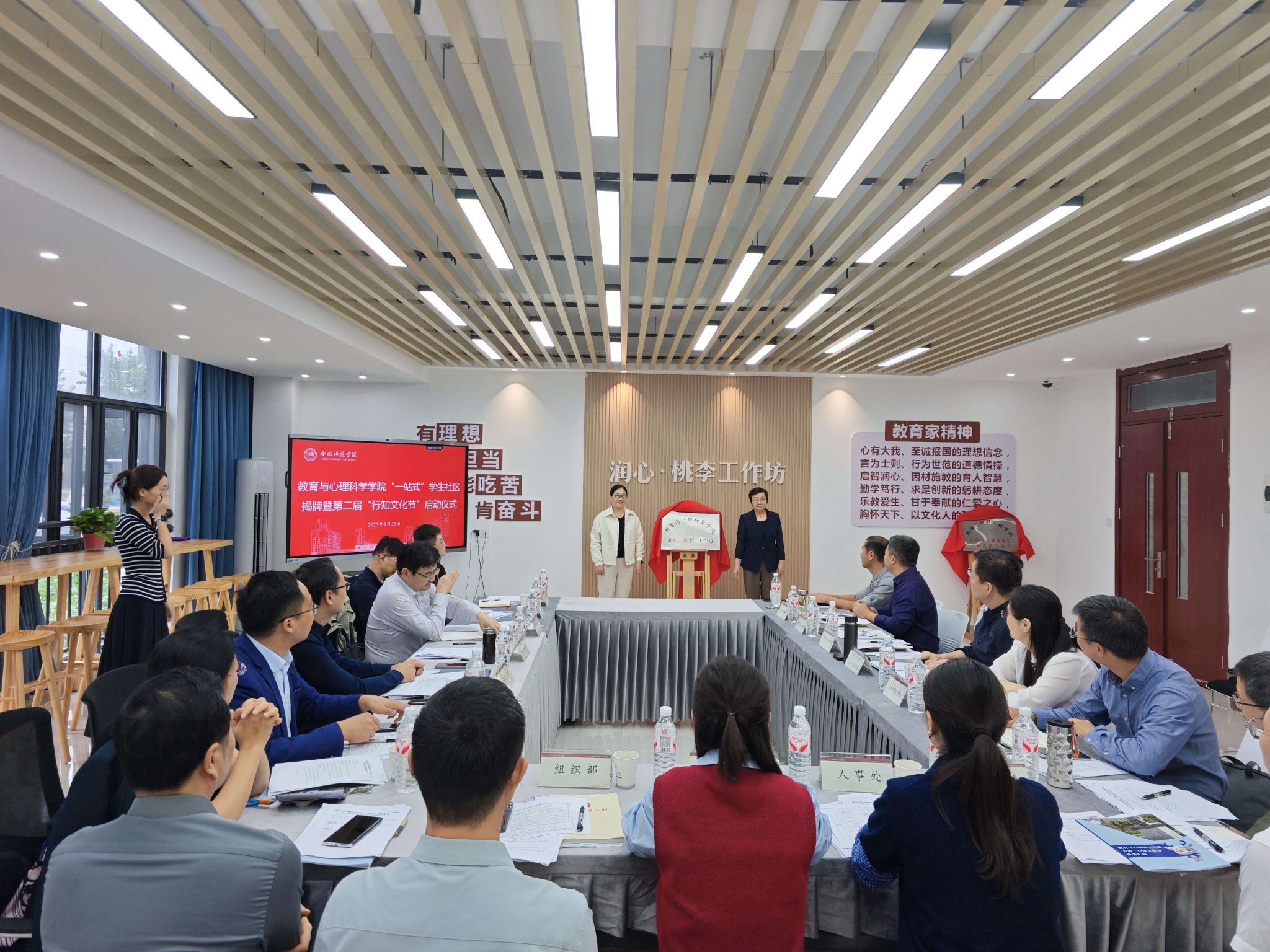 9月25日,教育与心理科学学院“一站式”学生社区揭牌暨第二届“行知文化节”启动仪式在滨湖校区12栋104室“润心·桃李”工作坊隆重举行。学院党委副书记梁立昌出席仪式,相关职能部门与二级学院负责人参加活动。启动仪式由教育与心理科学学院党委书记董萍主持。