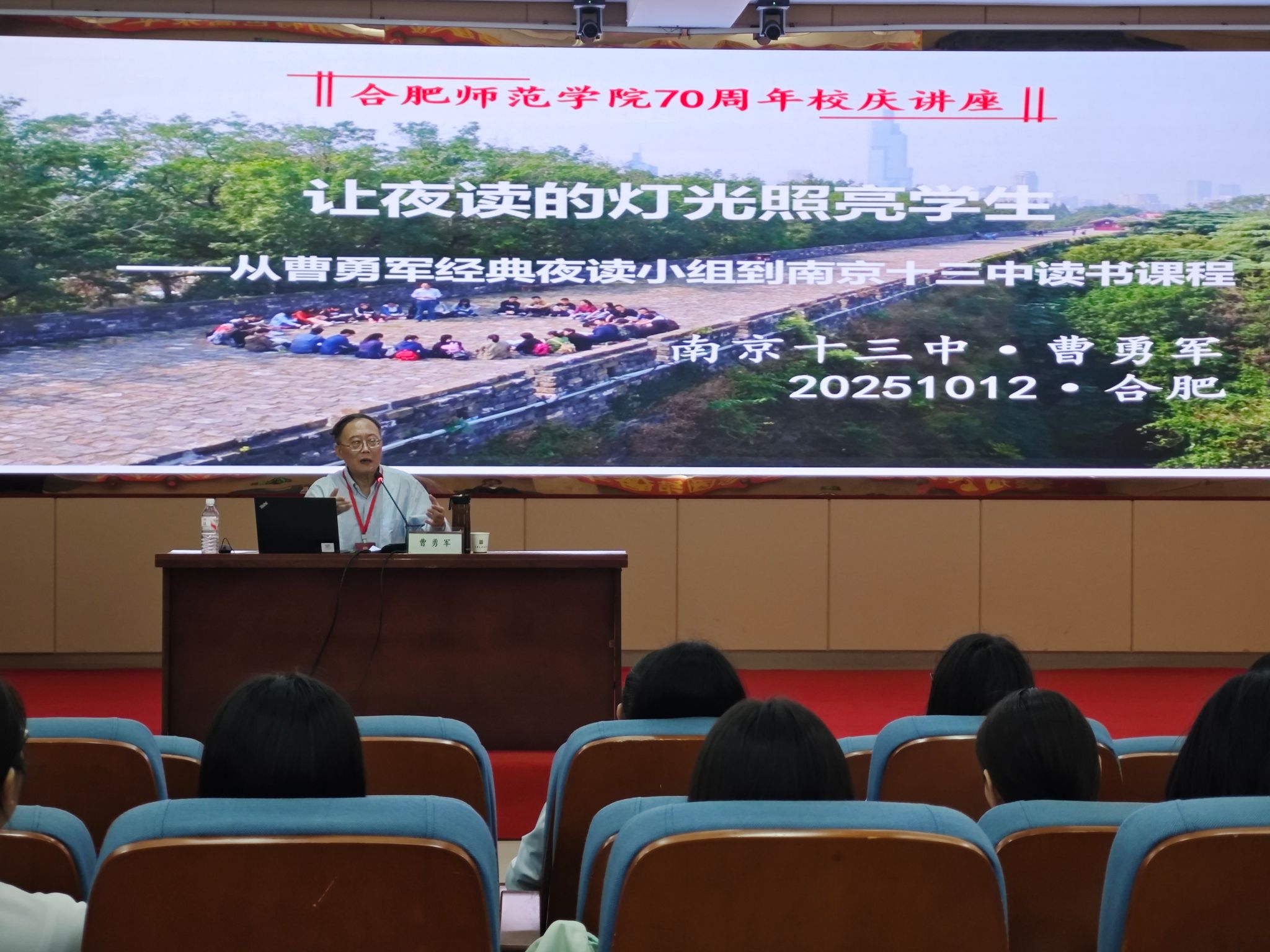 10月12日下午,由beat365在线唯一官网科研处和文学院联合主办的70周年校庆学术讲座活动在锦绣校区学术报告厅举行。文学院1986届校友,江苏省特级教师、南京市十三中教授级高级教师曹勇军作了题为“让夜读之光照亮学生——从曹勇军经典夜读小组到南京十三中读书课程”的学术讲座。学院2024级、2025级学科语文教育硕士研究生和部分汉语言文学专业本科生参加讲座,讲座由文学院院长何旺生主持。