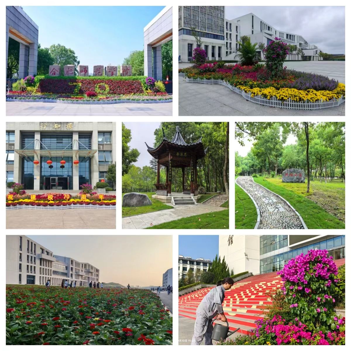 后勤处(基建办)提前谋划、周密部署,开展校园环境“微治理、微优化、微提升”行动,将校园“绿化、美化、亮化、优化”工作落小、落细、落实,对校园环境进一步提档升级,在校园大门、主干道、主会场周边等关键区域围绕“七十华诞”设计元素,打造了多处色彩鲜艳、造型优美的花境造型,在校园空置区域建设校友捐建的园林式景观思源亭、巧用鹅卵石铺设的“阡陌小道”、利用滨湖校区理科楼北侧空地种植的百日菊园,成为校庆期间校园新兴“打卡点”。