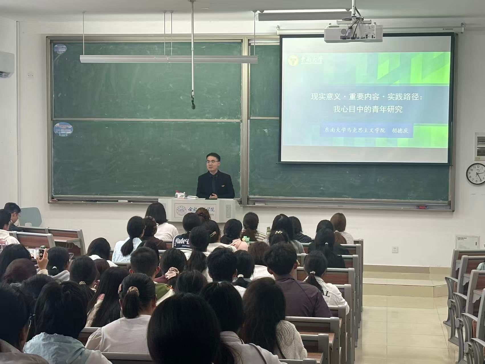 10月15日下午,马克思主义学院2014届优秀校友、东南大学马克思主义理论专业博士研究生胡德庆在滨湖校区为思想政治教育专业本科生做了一场报告。2025级思想政治教育专业全体新生参加。报告会由副教授傅文茹主持。