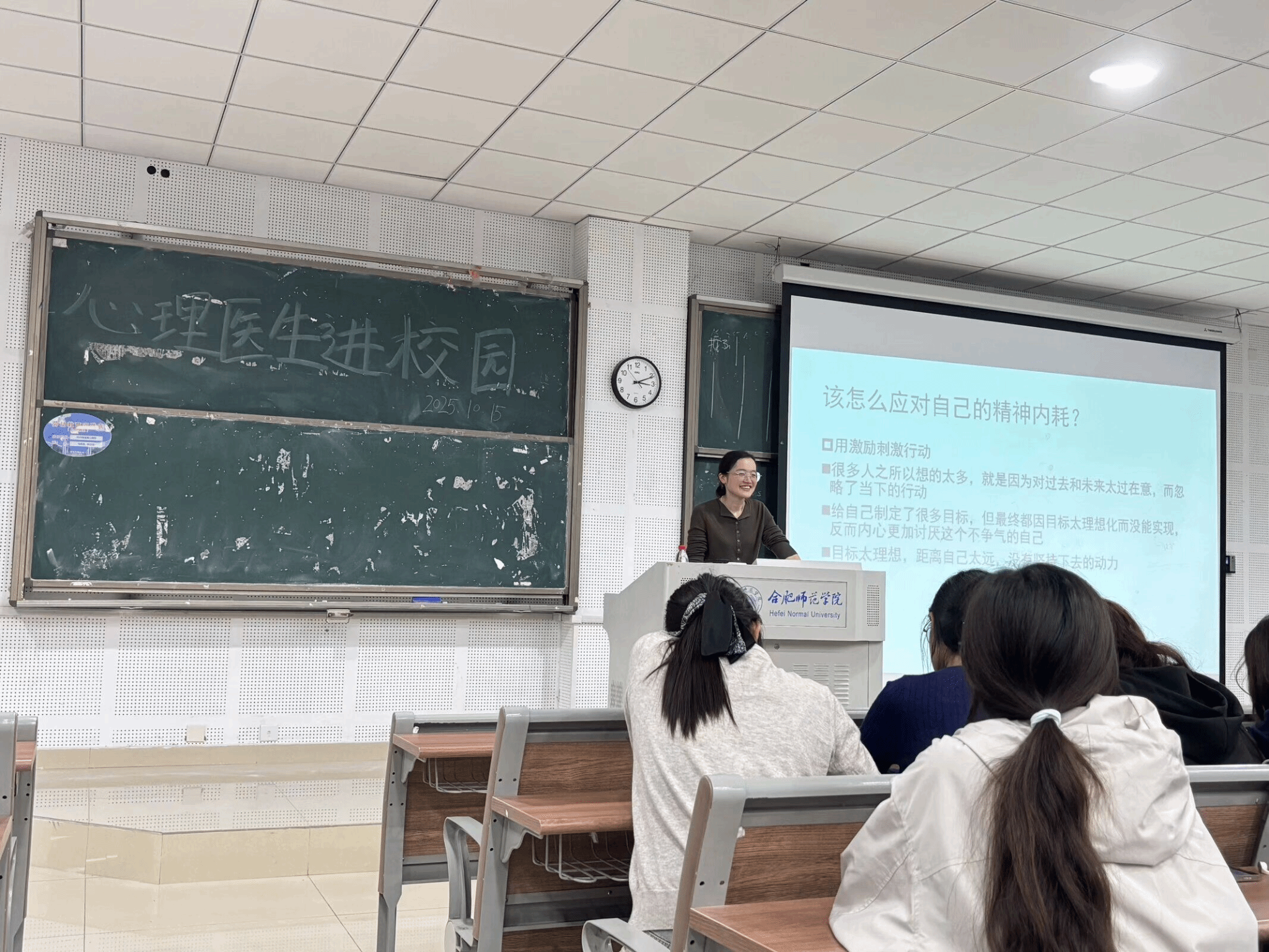 作为宣传周核心,“心理医生进校园”主题活动邀请精神卫生专科医生开展科普讲座。安徽精神卫生中心焦虑抑郁科主治医师李田霞以“停止焦虑 拒绝内耗”为主题结合临床案例解析焦虑情绪的生理机制与心理表现,厘清正常焦虑与焦虑障碍的边界,明确精神内耗的危害,系统传授“认知重构三步法”“正念认知疗法” 等实用干预技巧,并通过现场互动答疑破解学生“越控制越焦虑”的认知误区。安徽医科大学附属巢湖医院精神科副主任医师宋苏琪则聚焦大学生群体痛点,以《内卷、精神消耗、emo、摆烂、躺平》为题,用数据还原当代大学生心理压力图谱,从社会环境与个体认知双维度剖析负面情绪产生根源,并结合生动案例,分析了这些现象背后的心理机制,提供了实用应对策略,引导学生建立健康的应对机制。讲座现场互动热烈,学生们纷纷表示受益匪浅。