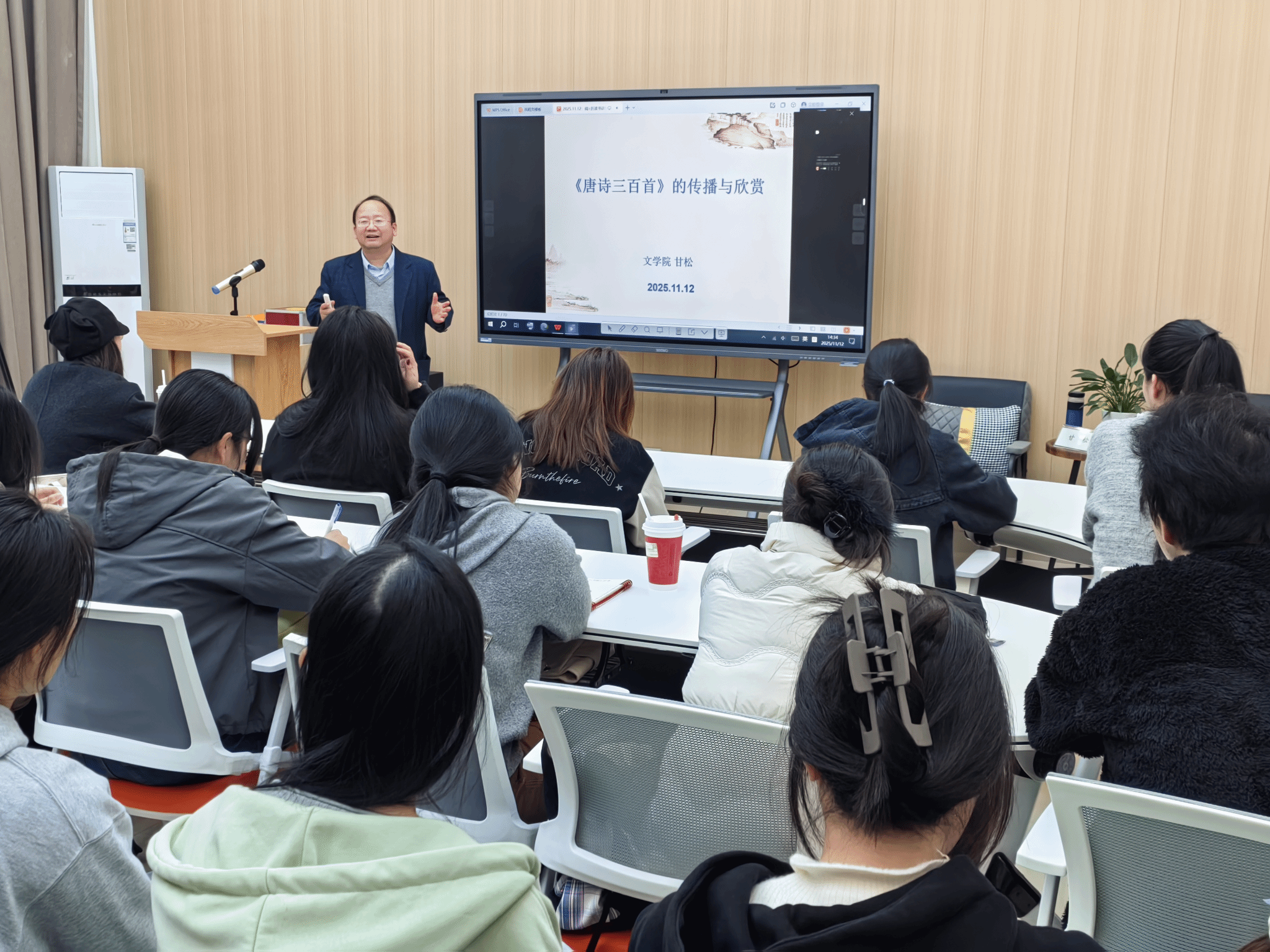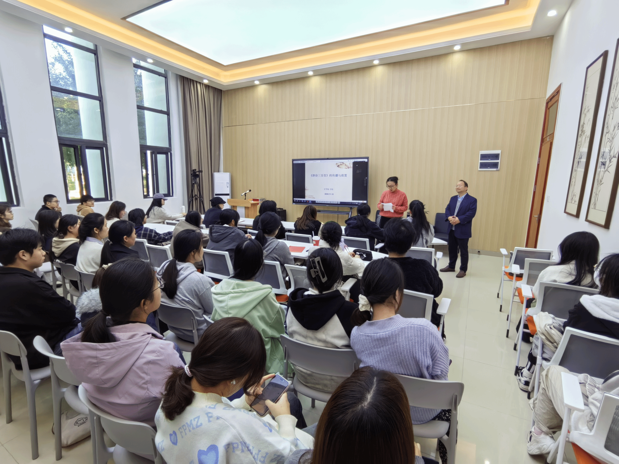 11月12日下午,滨湖校区“阅+历”读书讲堂第五讲开课。本次讲座以“经典传承与文化浸润”为主题,特邀文学院副院长、硕士生导师、北京大学访问学者甘松教授担任主讲嘉宾,聚焦《唐诗三百首》的传播与欣赏。校阅读推广人、外国语学院吴蓓老师担任主持人。本次讲座旨在深化校园阅读文化,提升学生人文素养,通过“唐诗”这一中华文化瑰宝,激发青年学子对传统文学的热爱与思考。