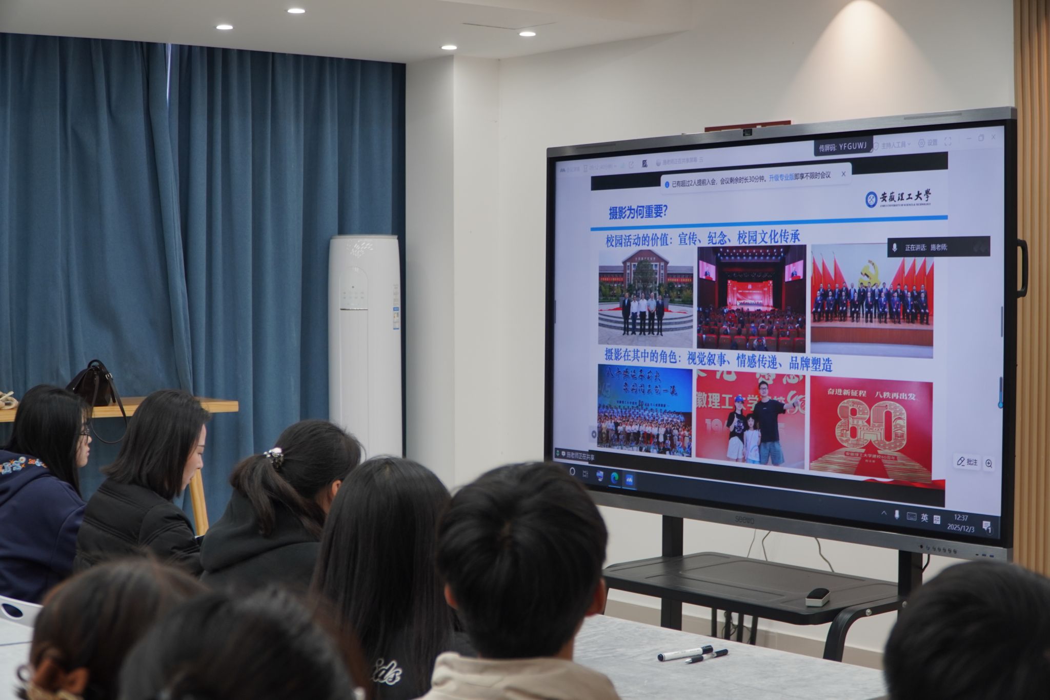 本次培训以“校园活动拍摄要领与实战技巧”为主题,特邀安徽理工大学党委宣传部融媒体中心主任施培松主讲。课程围绕校园大型活动前期筹备、实战拍摄核心要领、后期处理与成果交付、常见问题与处理方式等模块展开,通过理论讲授、案例分析与线上研讨相结合的方式,帮助学员建立全流程拍摄思维,攻克复杂现场拍摄难题,提升视觉叙事能力与团队协作意识。