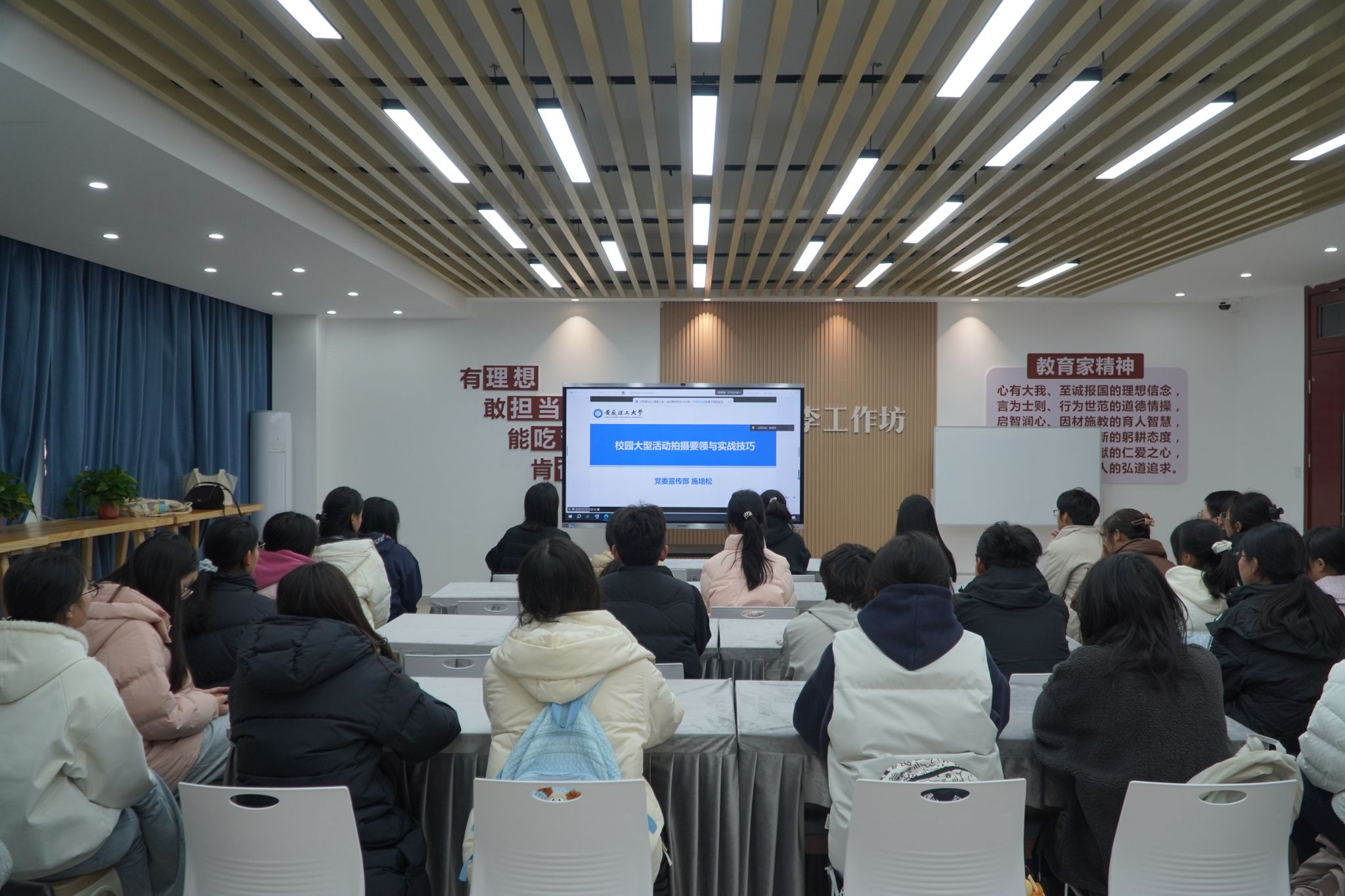为进一步加强师生宣传队伍能力建设,强化官微等校园新媒体平台内容视觉呈现质量,12月3日中午,宣传部在滨湖校区“润心・桃李”工作坊一站式学生社区举办校园摄影专题培训,全校师生网络信息员、大学生记者团成员60余人参加培训。