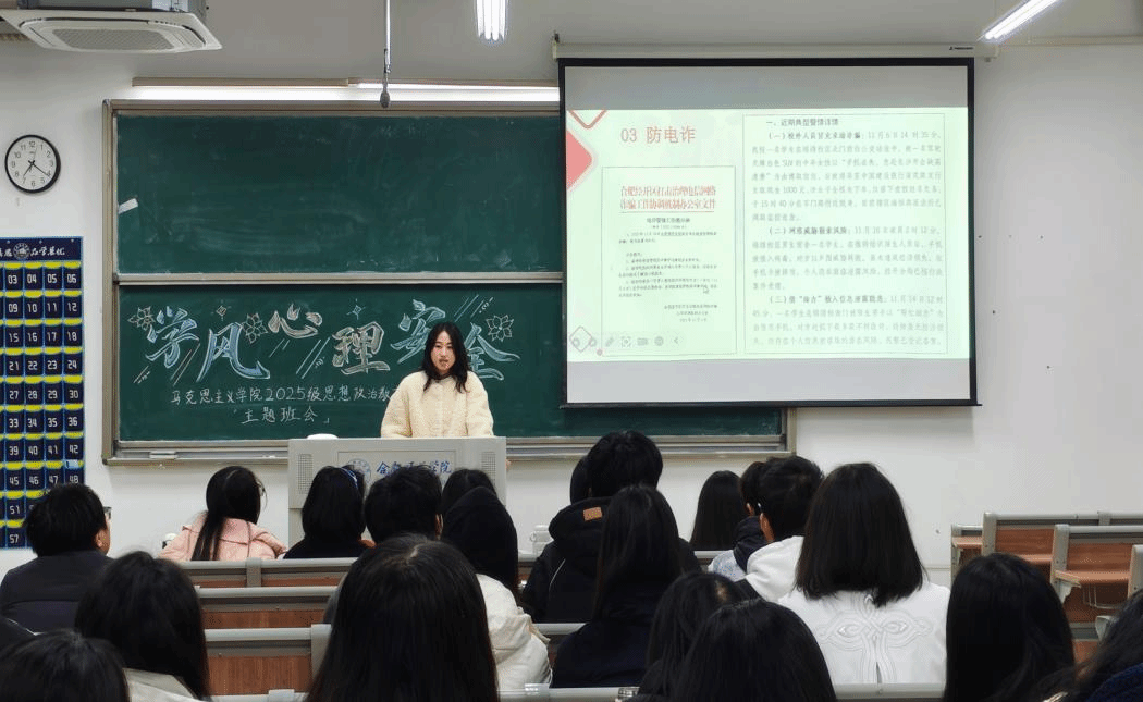 为进一步夯实学风建设根基,增强学生安全防范意识,促进心理健康成长,12月3日至9日,马克思主义学院分别在锦绣校区、滨湖校区同步开展“学风提质·安全筑基·心理赋能”主题班会。